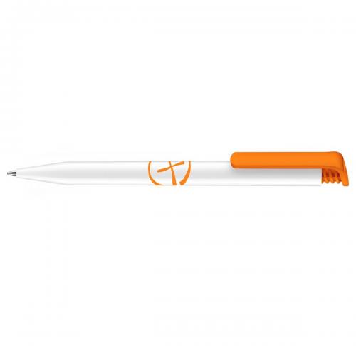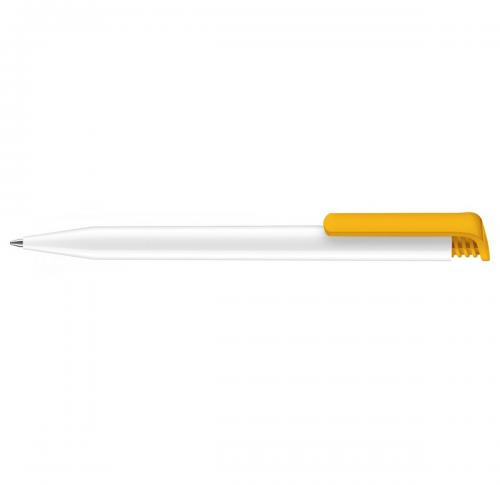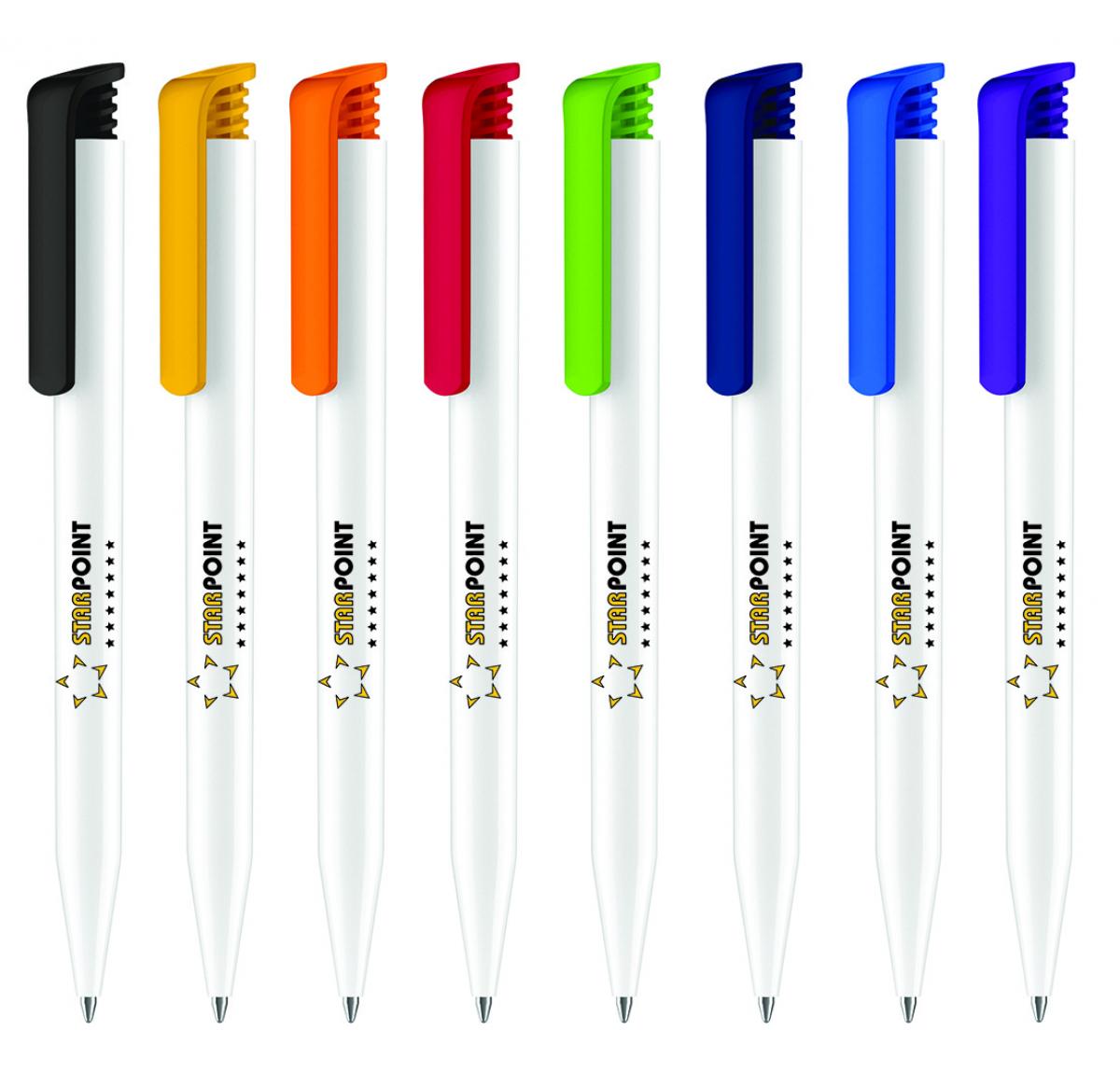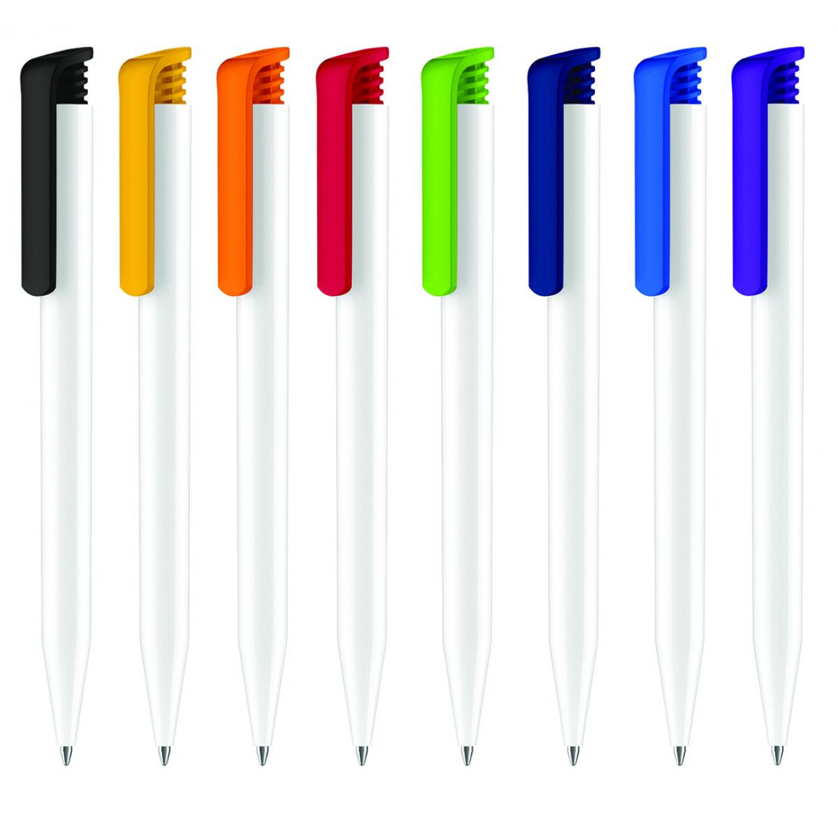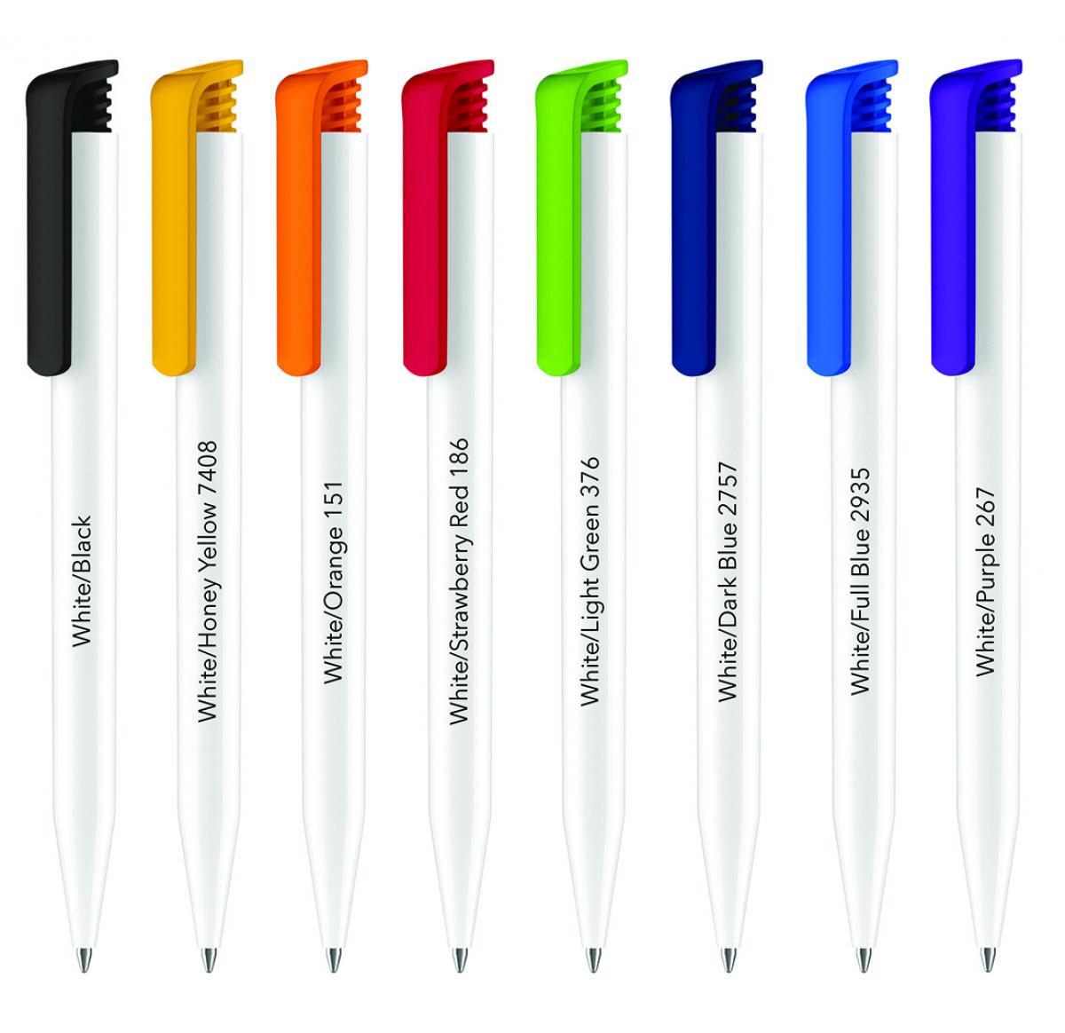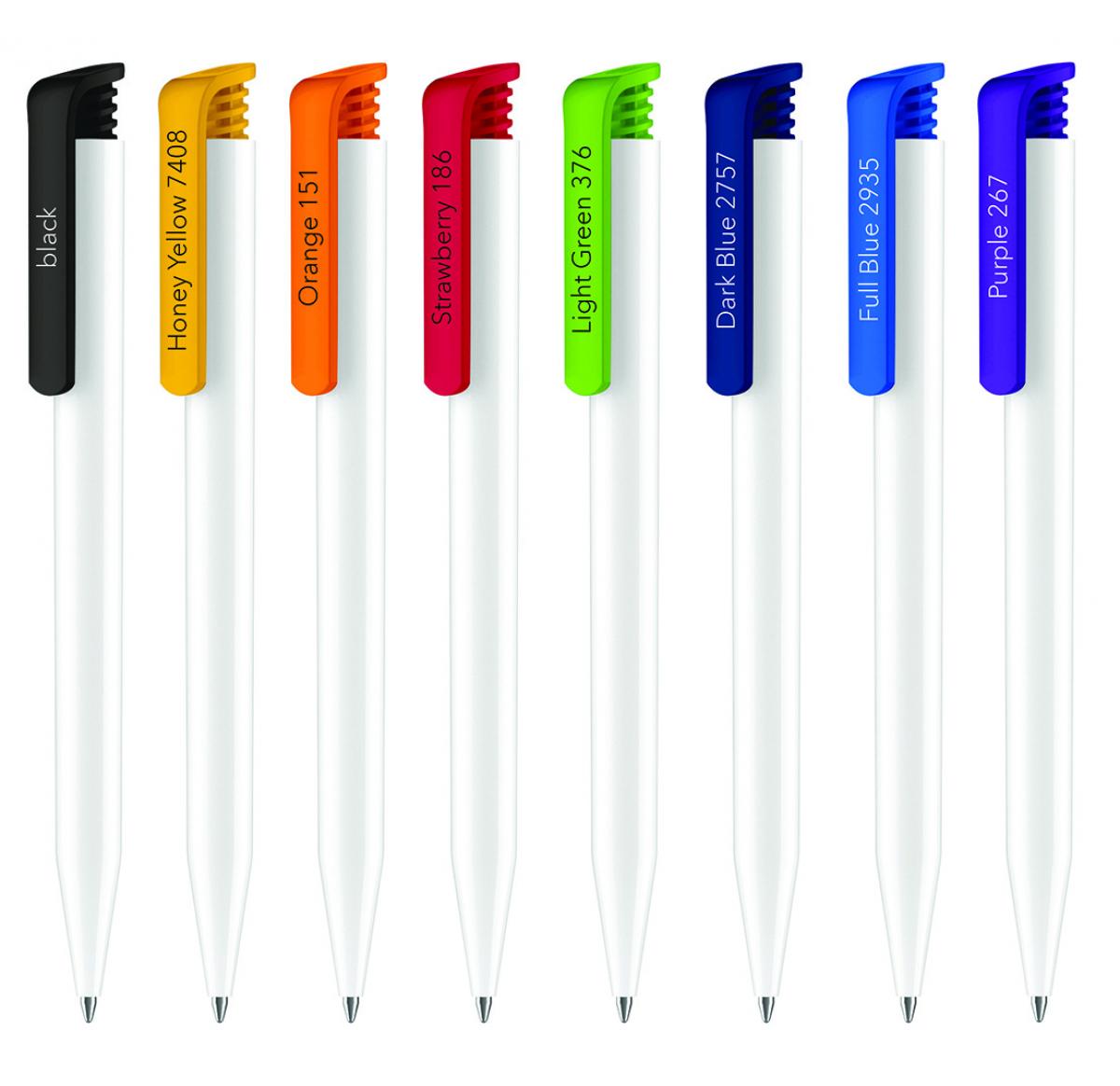 Evergreen and million seller. Ballpen with opaque high-gloss finish white barrel, and clip in one of 8 popular colours. Fitted with large capacity Magic Flow refill. Now available with our HD Digital print for unlimited colours and gradients (white barrel only).