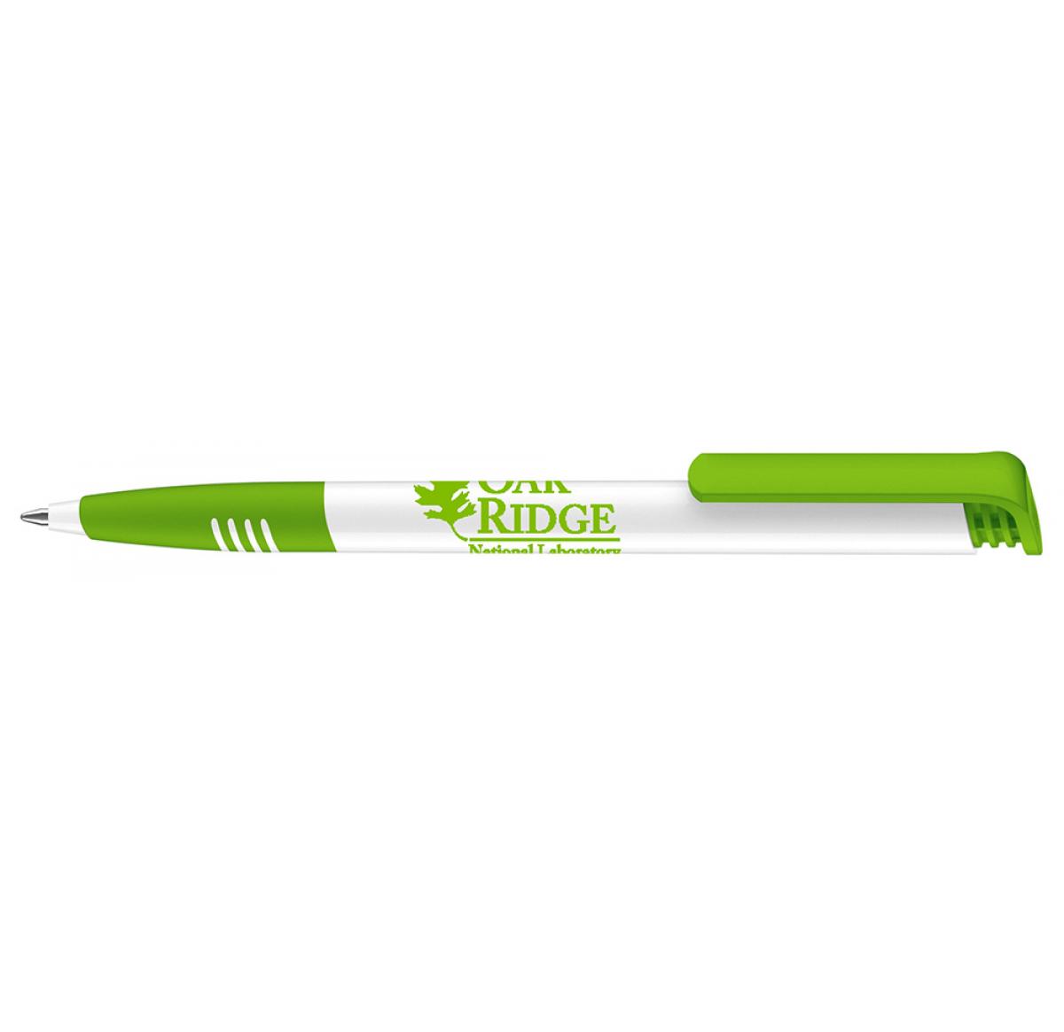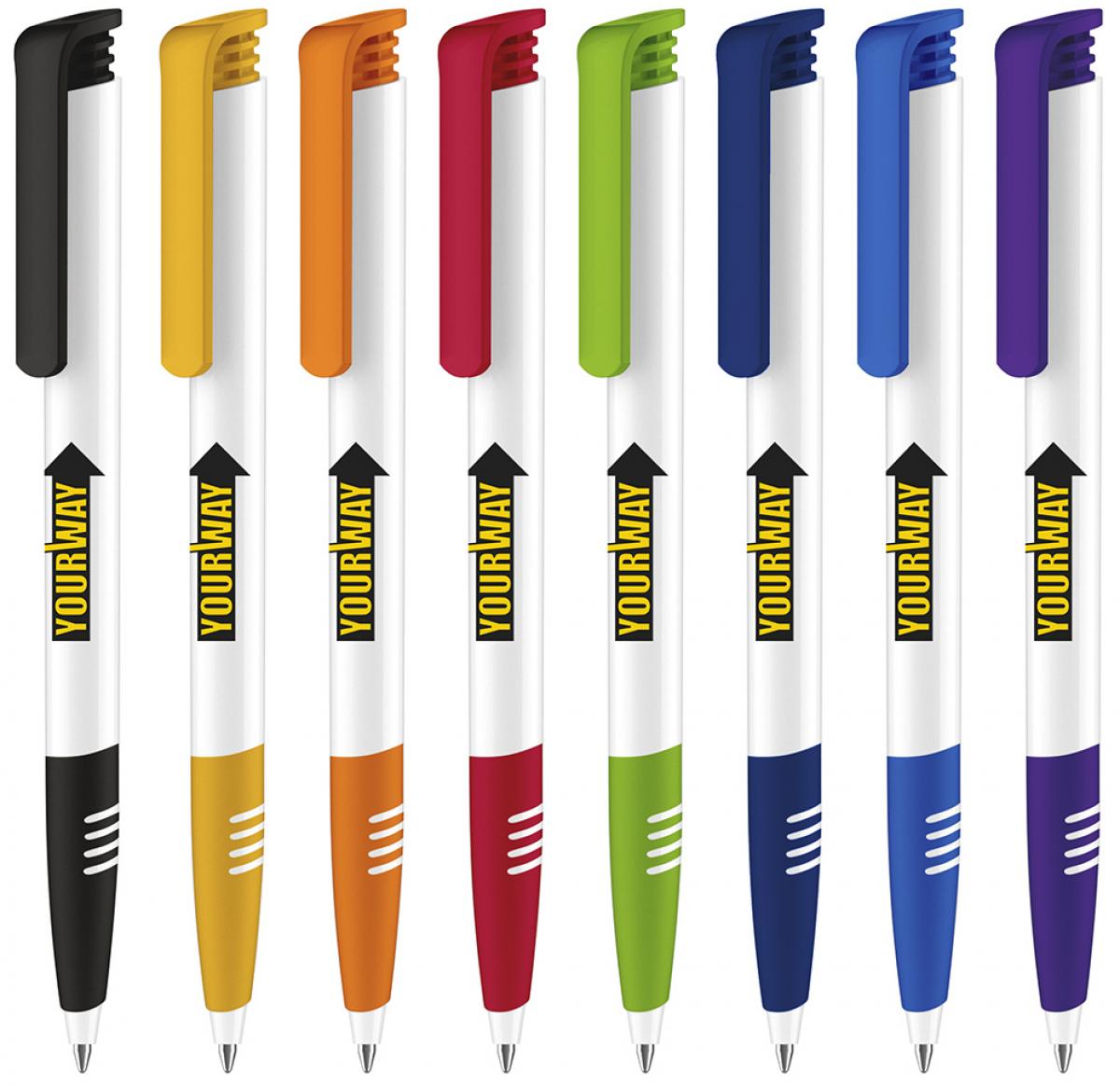 Evergreen and million seller. Ballpen with opaque high-gloss finish white barrel, featuring matching clip and soft-feel, satin-finish grip section in one of 8 popular colours. Fitted with large capacity Magic Flow refill. Also available without soft grip.