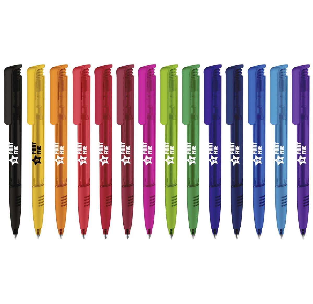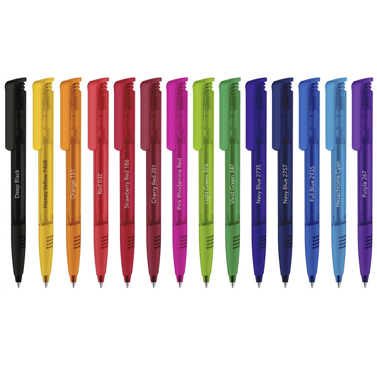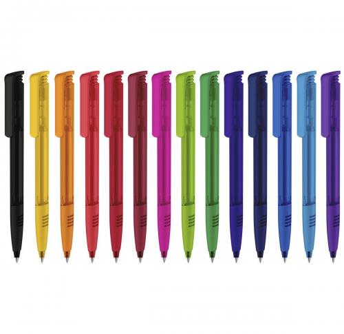 Evergreen and million seller. Ballpen with transparent high-gloss finish barrel, featuring matching opaque high-gloss clip and soft-feel, satin-finish grip section. Fitted with large capacity Magic Flow refill. Also available without soft grip.