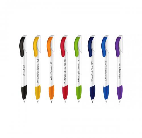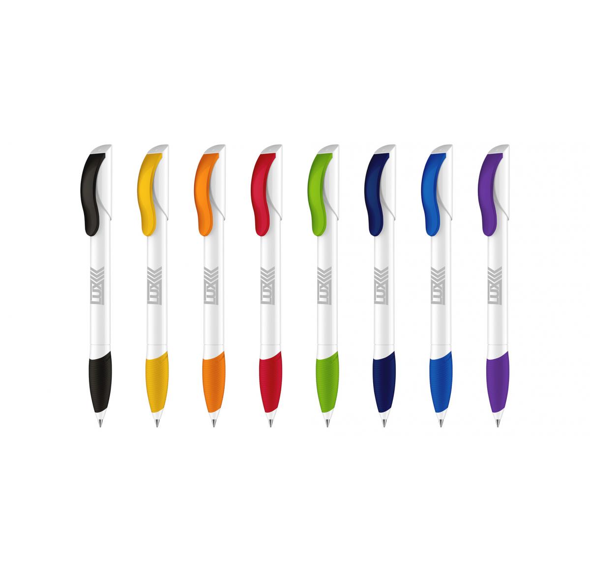 A cool look with a strong grip. Opaque high-gloss finish white barrel with matching coloured curved clip, upper and soft-feel, satin-finish grip section. Fitted with large capacity Magic Flow refill.