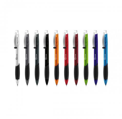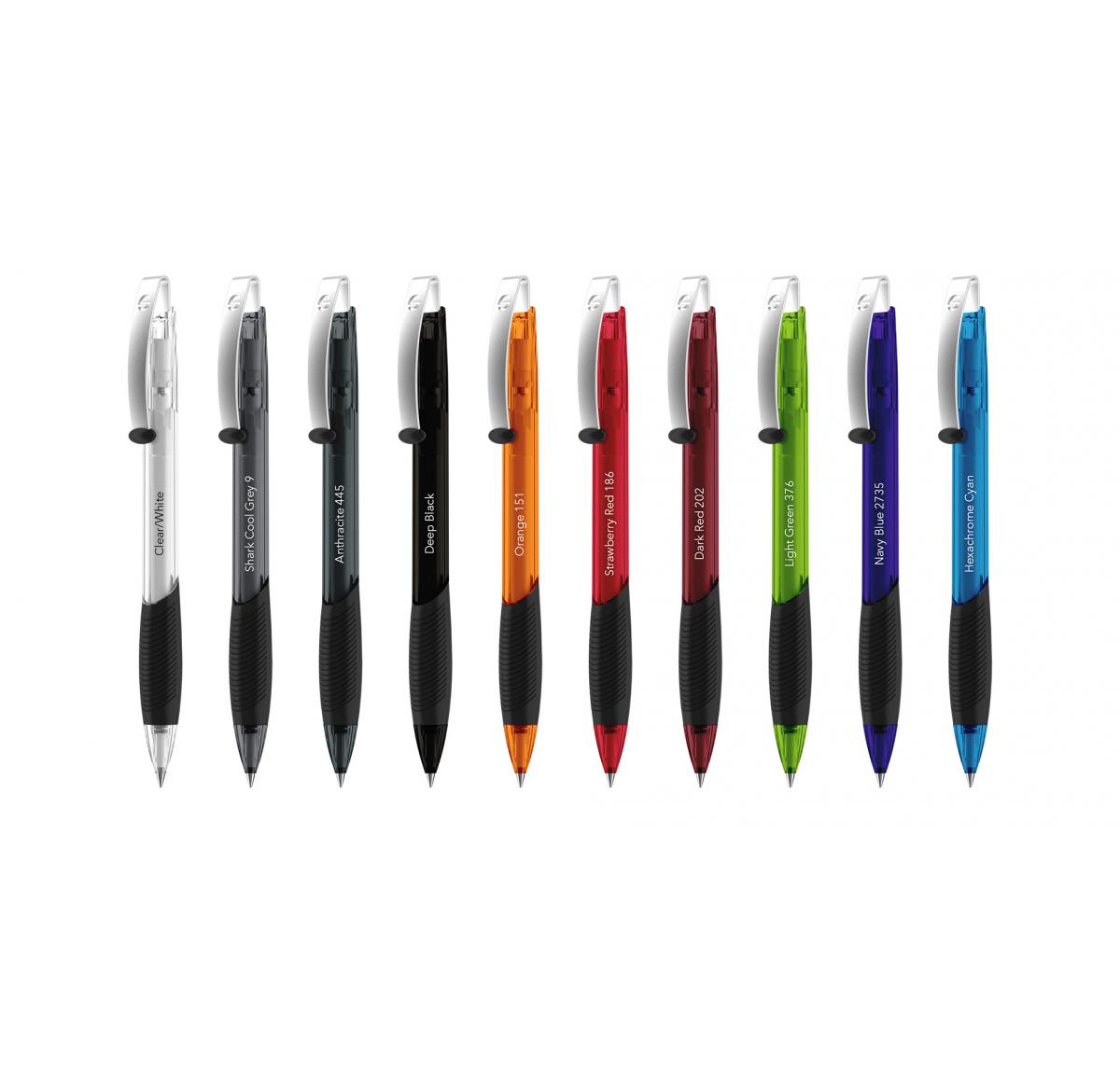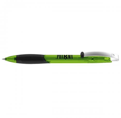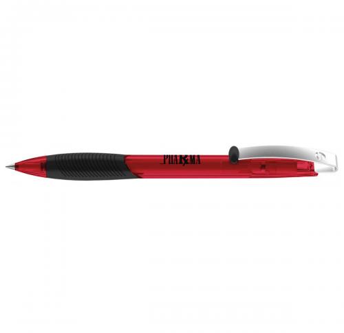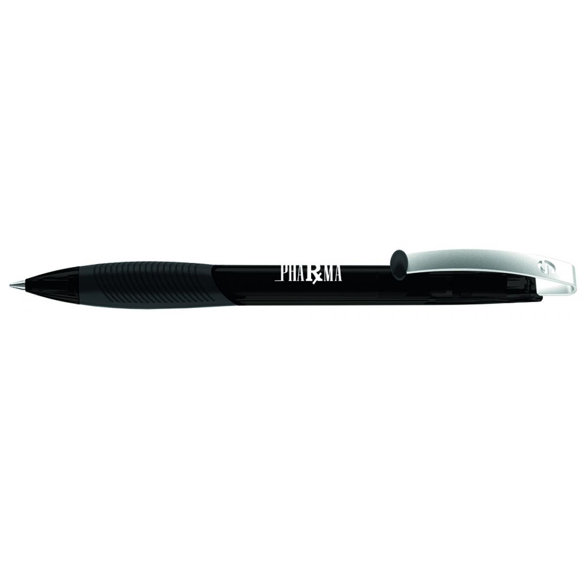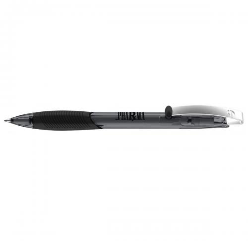 Cutting edge in form and function. Transparent high-gloss finish ballpen with soft grip zone and matt finish metal clip. Supplied with clip embellishment in black. Fitted with large capacity Magic Flow refill