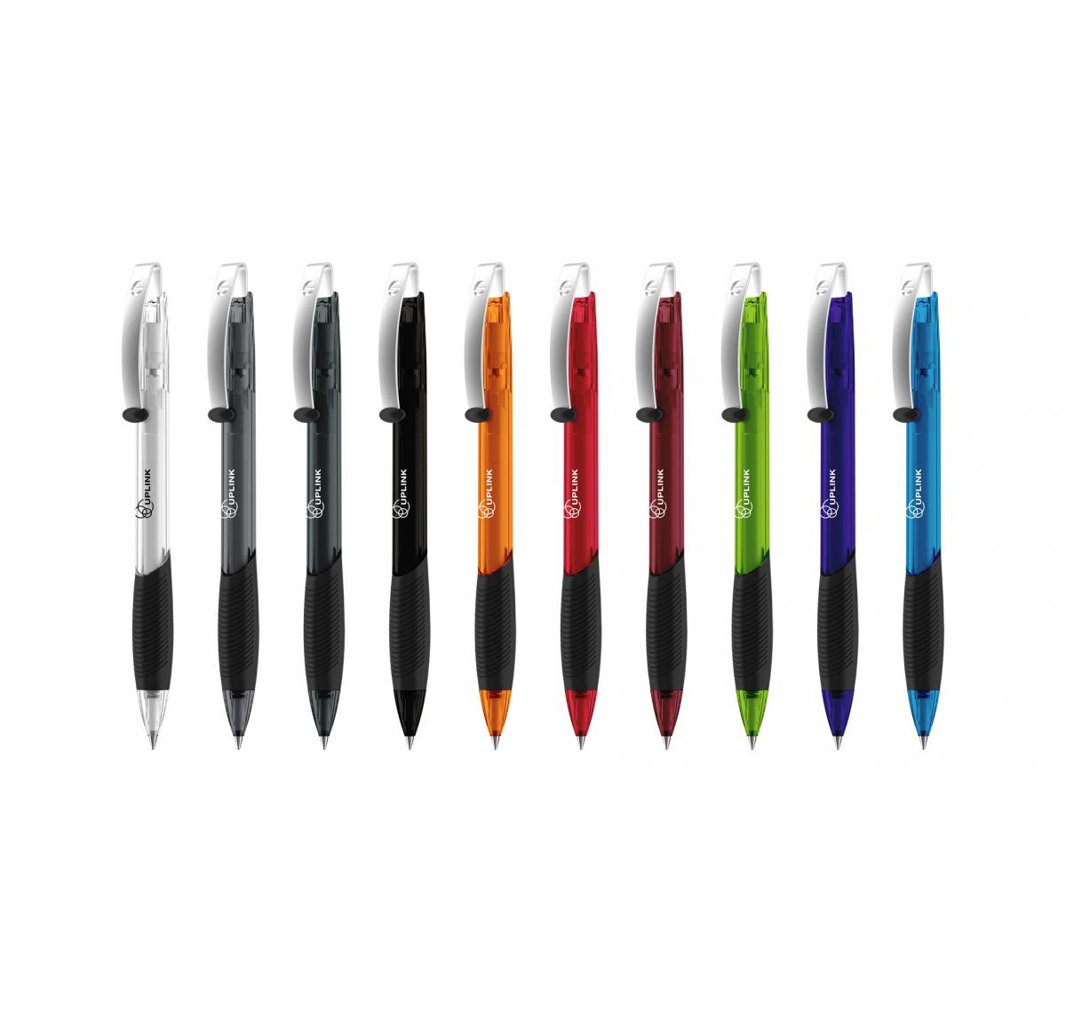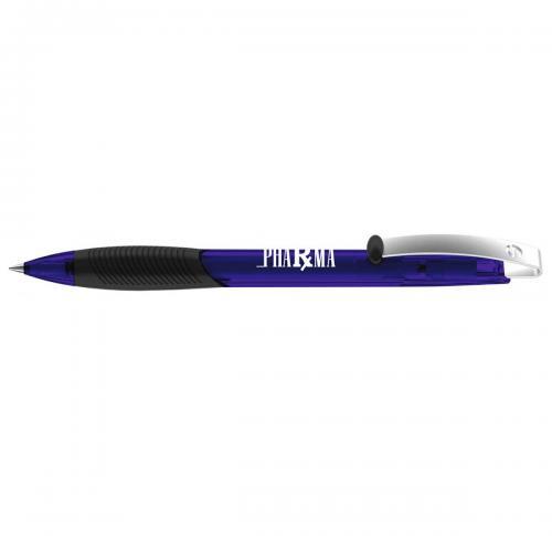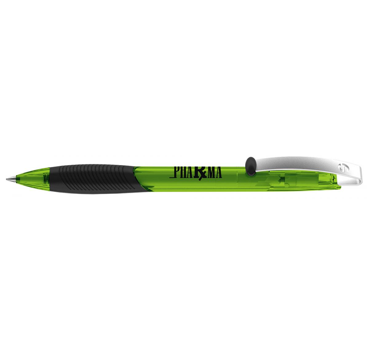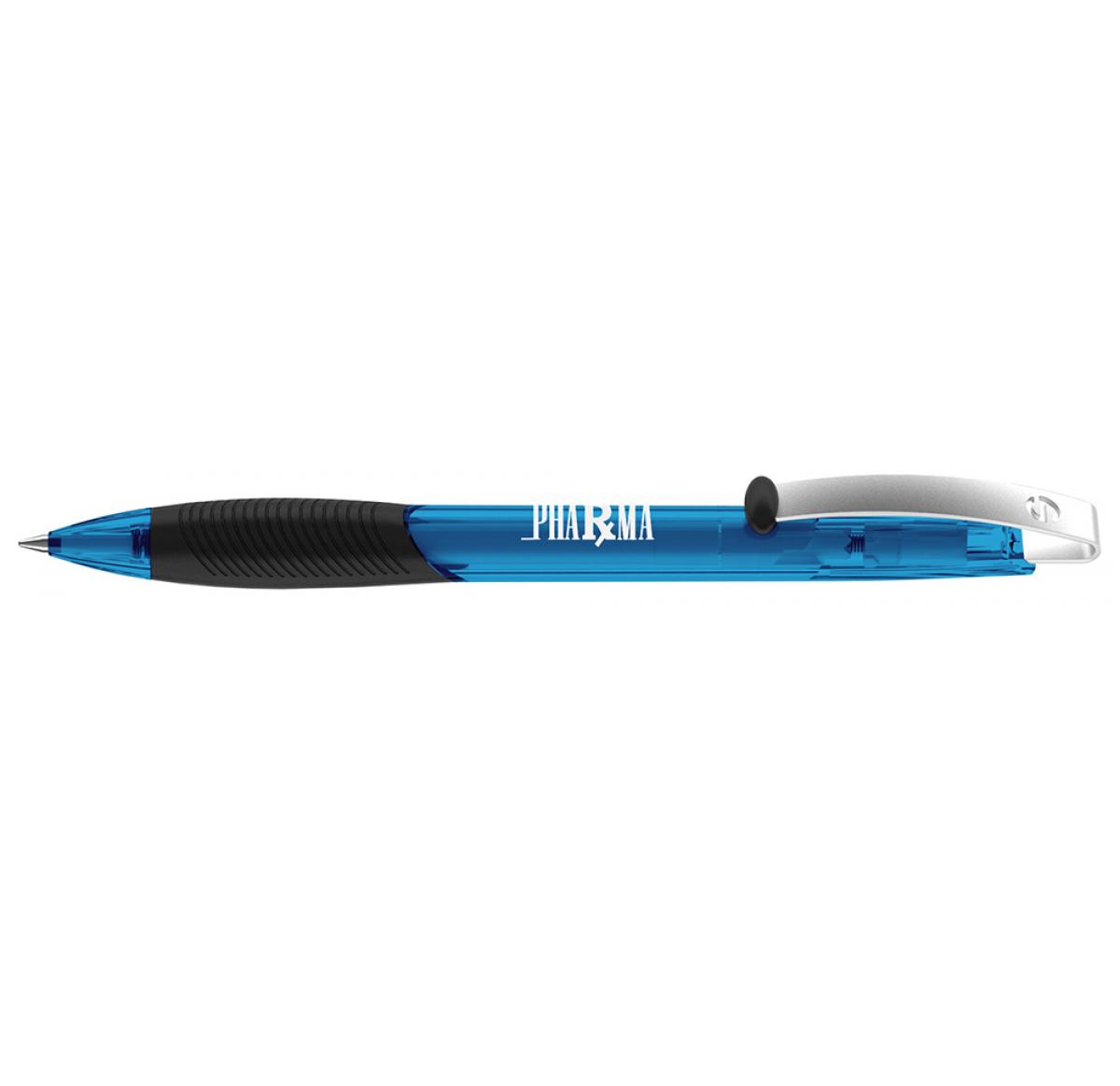 Cutting edge in form and function. Transparent high-gloss finish ballpen with soft grip zone and matt finish metal clip. Supplied with clip embellishment in black. Fitted with large capacity Magic Flow refill