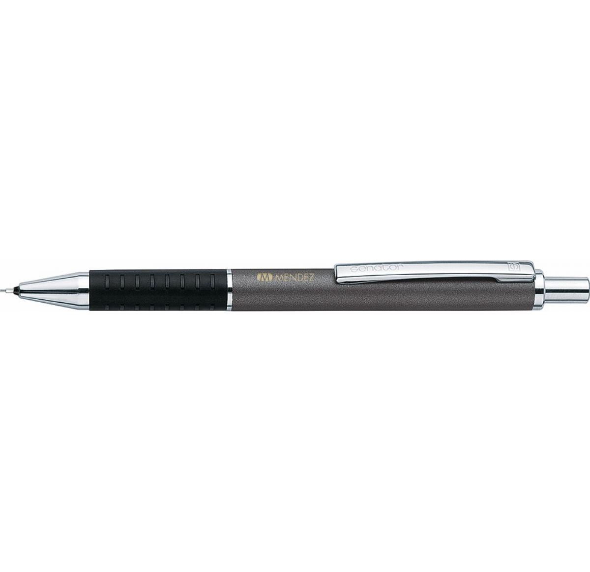 Timeless style for endless branding. Matt finish metal mechanical pencil with high-shine chrome clip and soft-feel satin-finish grip zone. Fitted with a 0.7mm pencil lead and integrated eraser positioned underneath the push-button. Supplied in individual black card giftbox.