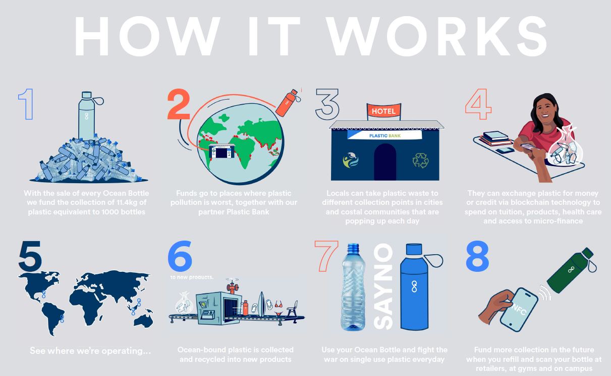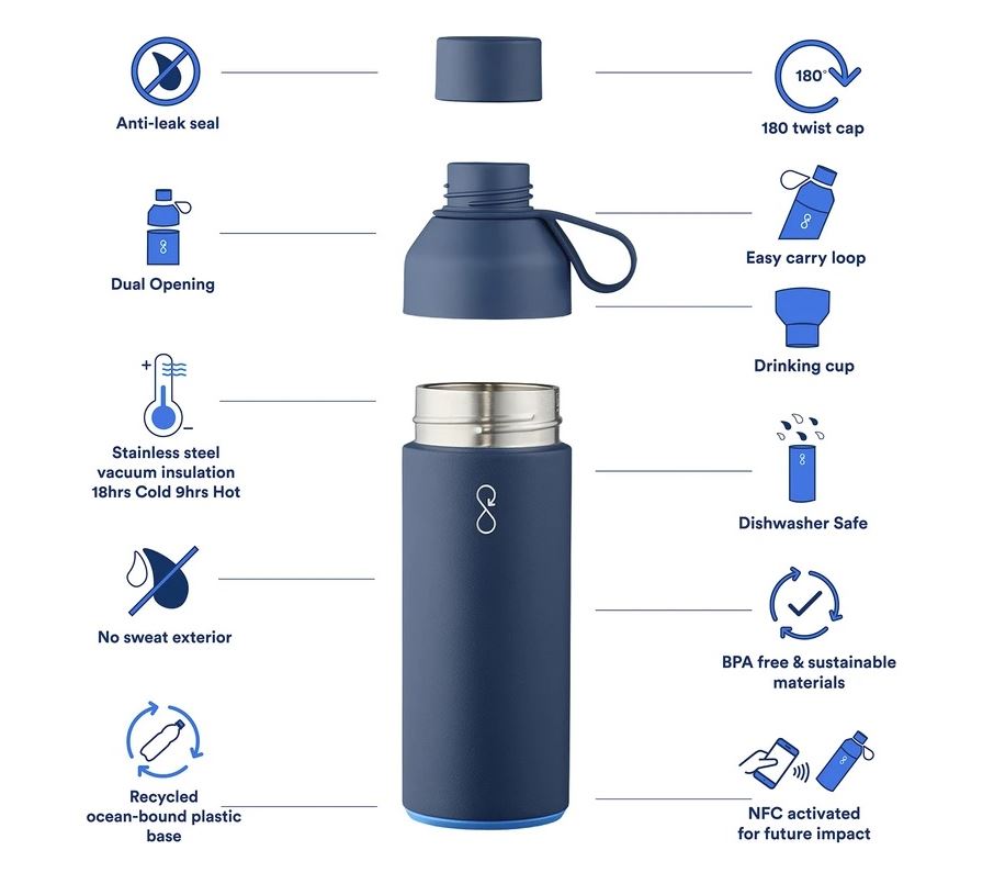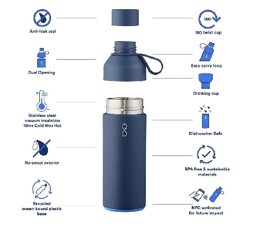 Wow! This bottle ticks the Eco boxes and more! Made from part recycled plastic and stainless steel, each bottle funds the collection of 11.4kg of plastic, the equivalent of 1000 plastic bottles! The stunning bottle is also vacuum thermal insulated keeping cold drinks cold and hot drinks hot. Complete with a hand silicone crry loop, double opening for easy drinking and dishwasher safe!