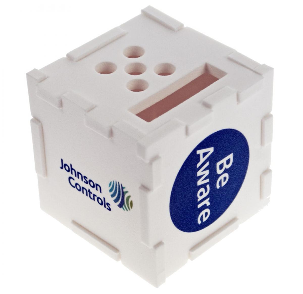 A Large 75mm foam cube desktidy puzzle which comes in a flat frame. Remove the pices from the frame and build a cube desktidy. Price includes 1 colour print.