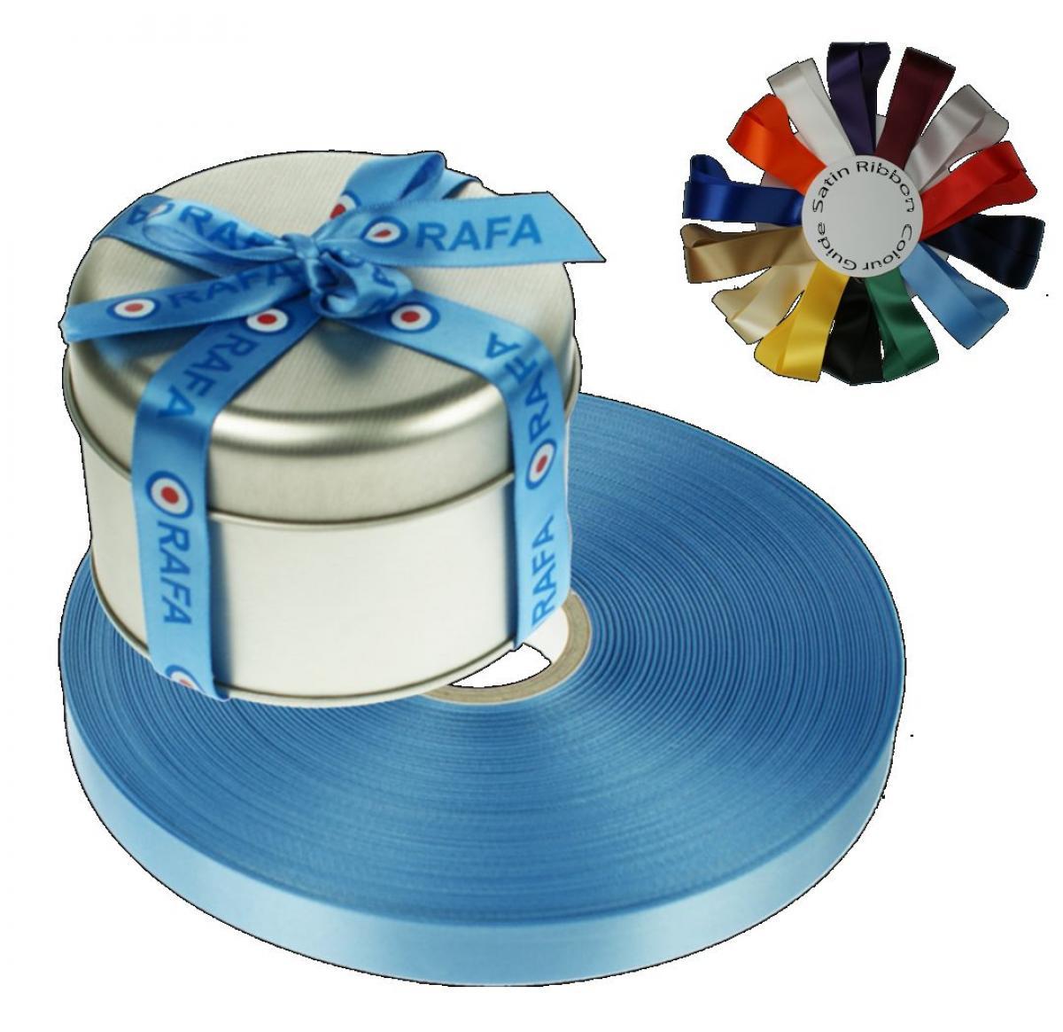 15mm single faced woven edge satin ribbon. Sold in quantities of 100m. ( 1 unit = 100m ) Minimum qty is 100m. Price is for max 3 colours and origination is £20 per colour