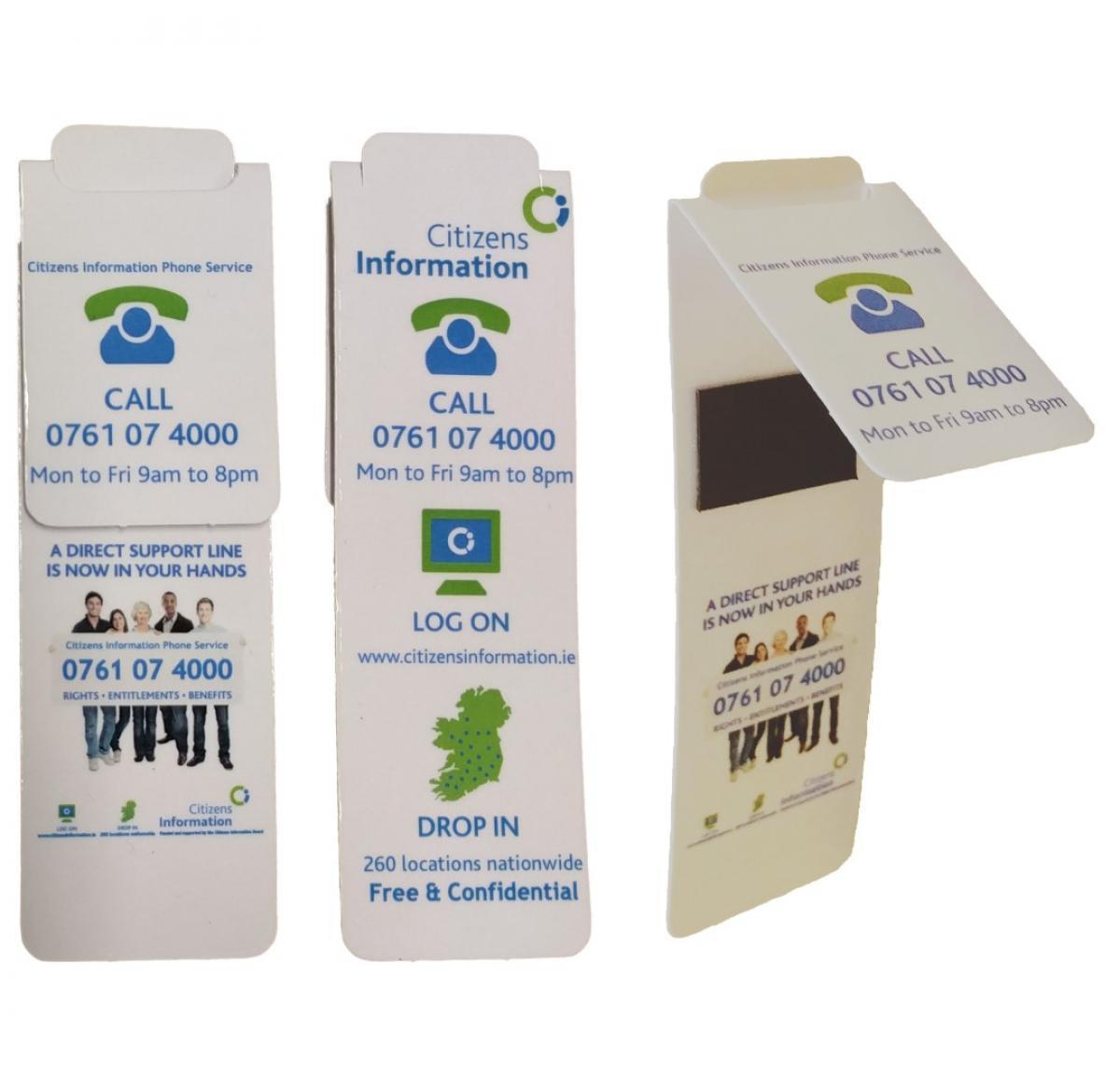 A magnetic Mini Marker bookmark where the top 3rd folds over and is held closed by 2 small magnets. Overall open size is 145mm x 30mm and closed size is 105mm x 30mmfor See picture oposite for print areas. Digitally printed up to full colour both sides and includes lamination both sides.