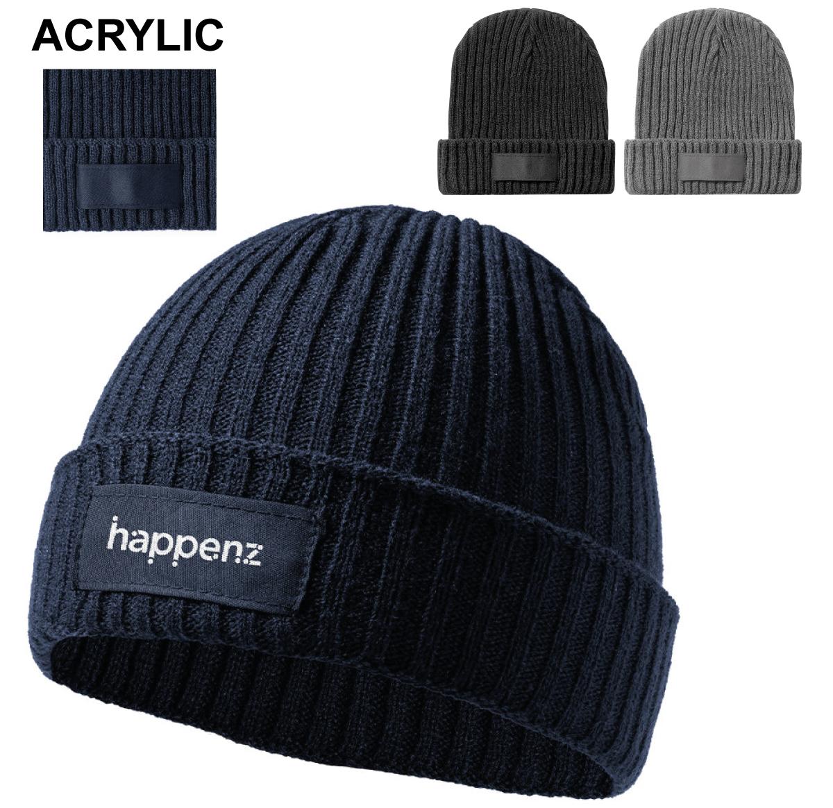 oft and warm ribbed knitted hat, made in elastic acrylic material. Including matching label for branding, and available in a wide range of colours.