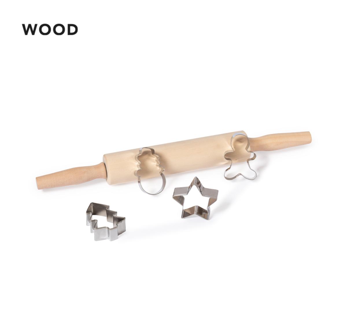 Christmas bakery set. Including molds made in stainless steel; and rolling pin made in resistant natural wood. Including rolling pin and 4 moulds in the shape of Christmas Tree, Star, Snowman and Gingerbread Man. Presented in a kraft box.