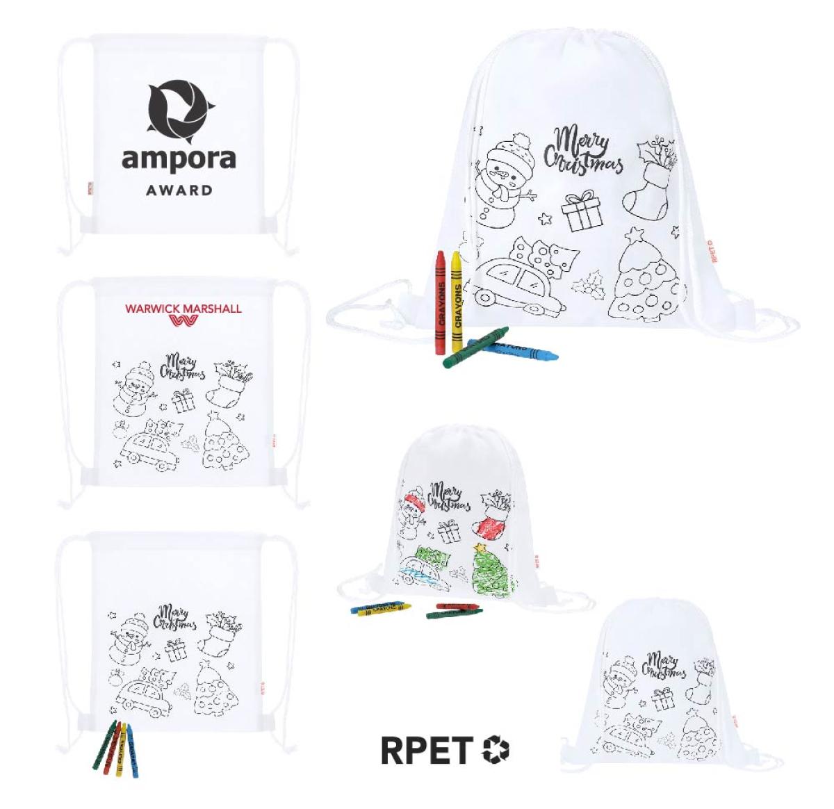 Children's Christmas backpack made of non-woven RPET, specially designed for colouring with crayons. With fun Christmas drawings, including 4 crayons in different colours. It has self-closing strings and fabric fasteners, and a RPET label outside. RPET material is made from recycled plastic, thus promoting the reuse of plastic waste and helping the sustainability of the planet.