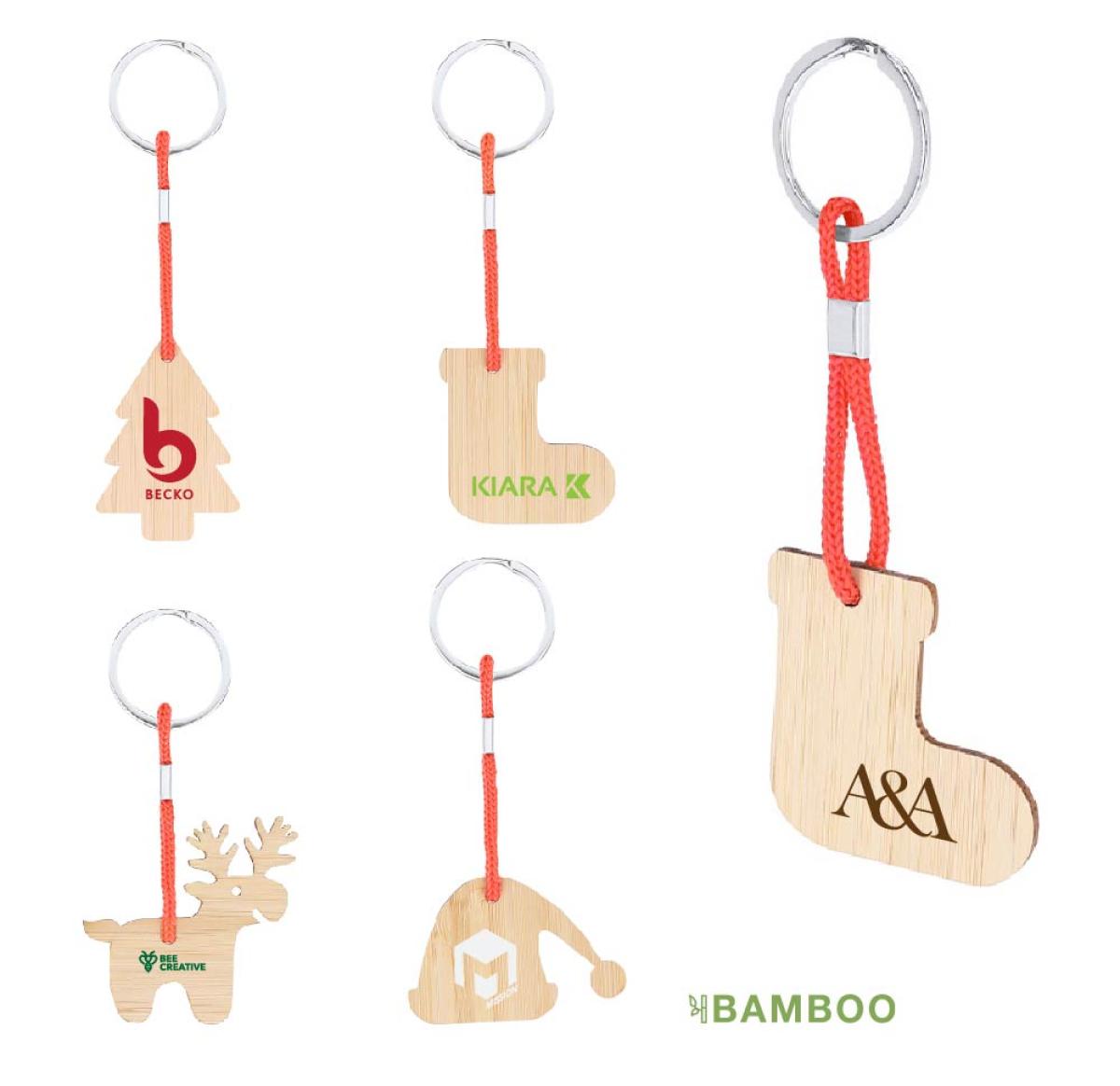 Keyring made of bamboo with Christmas motifs. Available in four original designs: Reindeer, Santa hat, Christmas tree and Sock. Materials such as bamboo promote the use of natural raw materials, thus reducing pollutant emissions. It comes from a highly resistant and versatile plant, with rapid growth and regeneration, making it an excellent alternative to the use of traditional wood.
