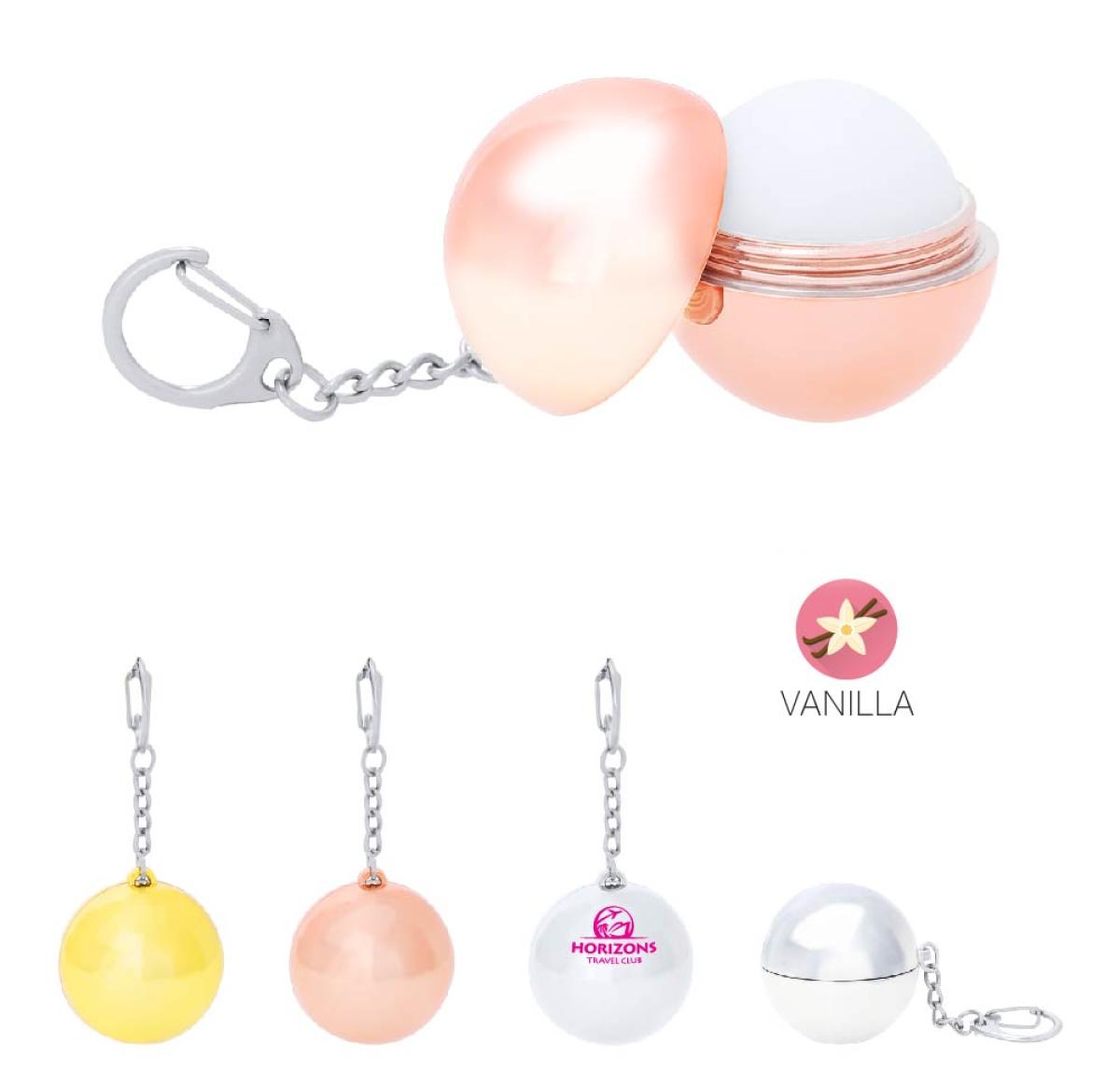 Lip balm keychain in the shape of a sphere in elegant gold, silver and rose gold colours. With handy carabiner keyring. Vanilla fragrance, SPF15 protection. dermatologically tested.