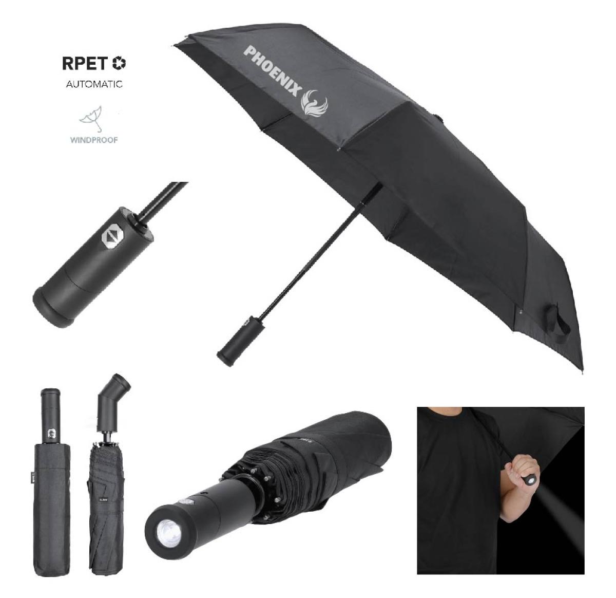 Umbrella made of RPET. With a practical 180? turning lantern handle in soft touch rubber and ON/OFF button. 105cm diameter, in 190T RPET pongee material. Automatic opening and closing, with windproof mechanism and fibreglass ribs. Label with RPET logo. Battery power supply (cell batteries included, NULL).RPET material is made from recycled plastic, thus promoting the reuse of plastic waste and helping the sustainability of the planet.