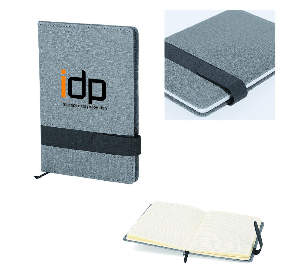 A5 notepad made of PU leather. Stylish grey design with a black magnetic closure band. Inside with 80 sheets in cream colour, with single stripe layout and matching bookmark made of fabric.