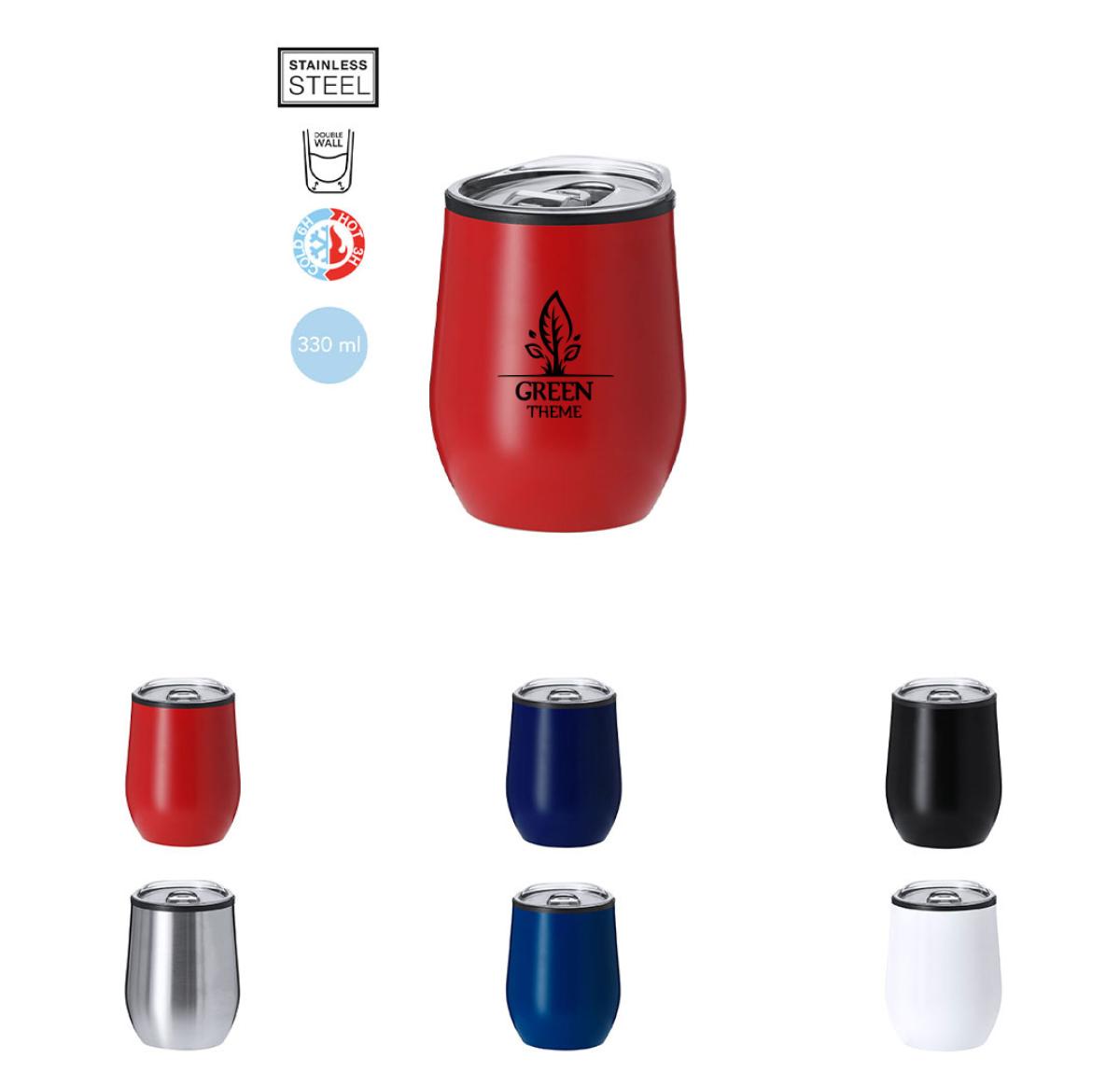 Thermal cup made of stainless steel with double wall and a capacity of 330 ml. With dispenser on transparent lid for easy opening, BPA-free. Ideal for keeping on your desk, table, or any surface to enjoy your favourite drink in peace.