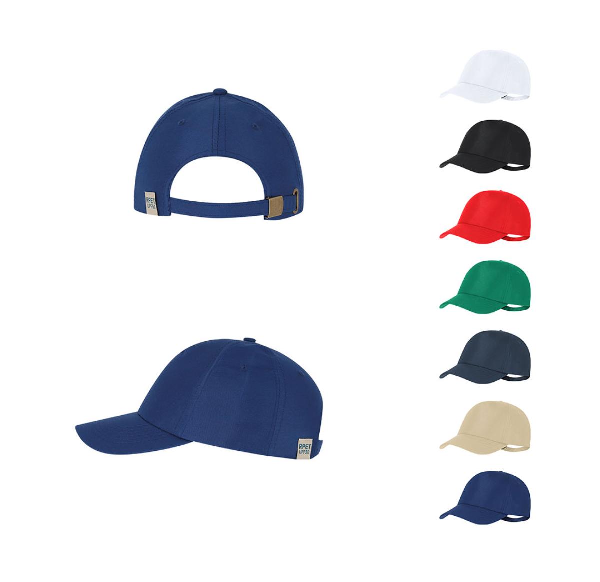 Sport cap with 5 panels in RPET polyester with UV50 protection. Adjustable metal buckle closure and embroidered ventilation holes. With RPET and UV logo on the label. RPET material is made from recycled plastic, promoting the reuse of plastic waste and helping the sustainability of the planet.