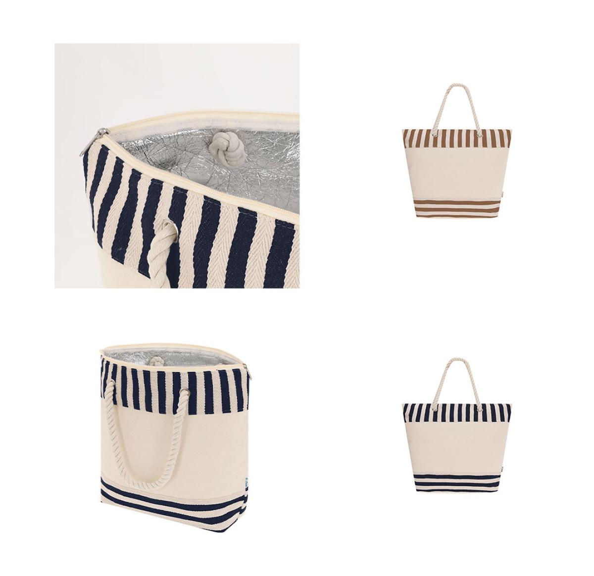 Thermal bag made of durable RPET material with aluminium interior, ideal for maintaining the temperature of food and beverages. With natural striped design matching colours. Includes zipper closure for added security and long cotton handles in rope format, reinforced with sturdy metal rings.