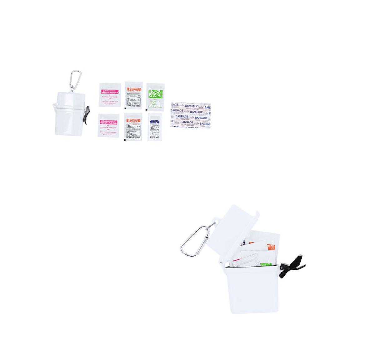 Hiking kit with 8 accessories presented in a sturdy ABS case, with a practical metal carabiner for easy transport. Includes hand cleaning towel, bite relief wipe, SPF30 sunscreen, aftersun, hydroalcoholic gel, and bandages.