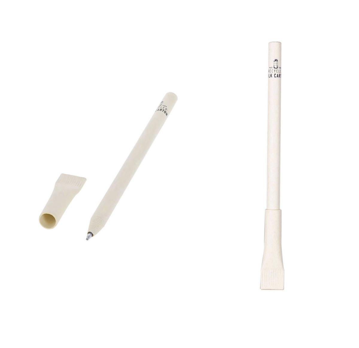 Pen with body made from recycled milk cartons and white details. With lid closure and blue ink, with recycled milk carton label on the body. Milk cartons are primarily made of cardboard and aluminium. During their recycling process, the different materials are separated for reuse and new use, contributing to the endless path of the circular economy. This material is characterized by its high recyclability, as well as its lightness and strength.