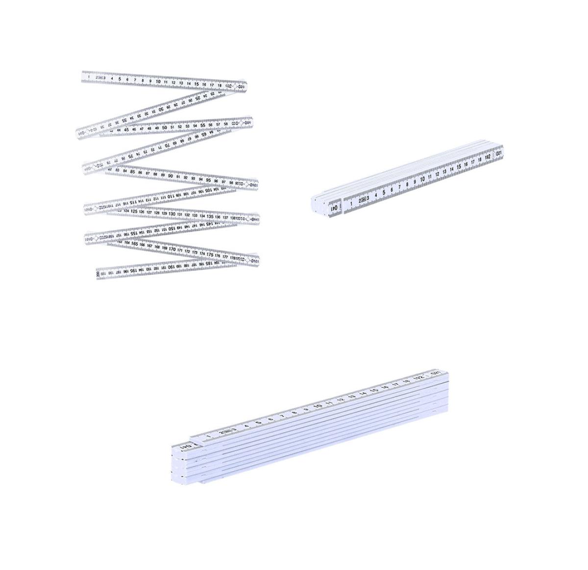 Foldable 2-metre ruler made from durable fibreglass. With centimetre scale in black, visible on both sides. With adjustable positions at 90?, 180?, and 270? for greater versatility.