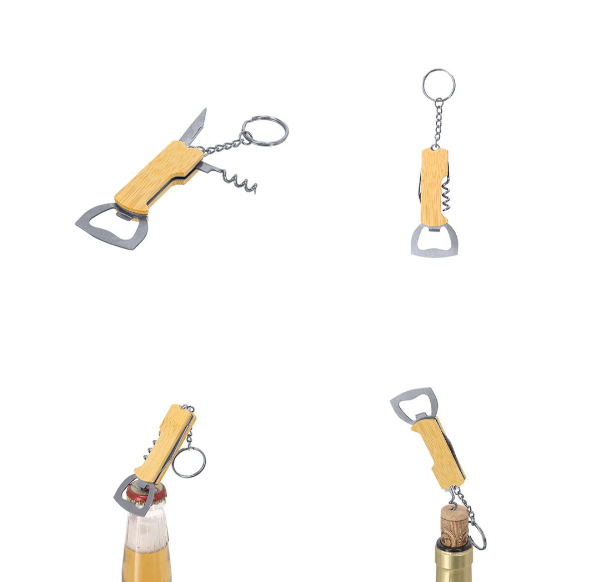 Keychain bottle opener made of bamboo and stainless steel, with a bottle opener and corkscrew, includes a knife and metal ring for keys. Materials like bamboo promote the use of natural raw materials, reducing polluting emissions. Additionally, bamboo comes from a plant of great strength and versatility, with rapid growth and regeneration, making it an excellent alternative to traditional wood.
