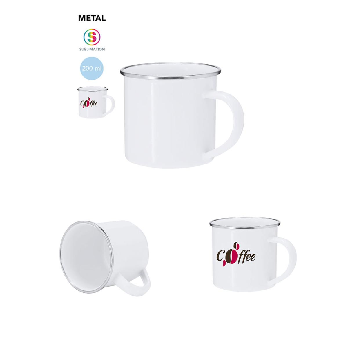 Metal mug with a capacity of 200 ml with a vintage design and glossy white finish with an elegant chrome detail on the edge. Designed especially for sublimation.