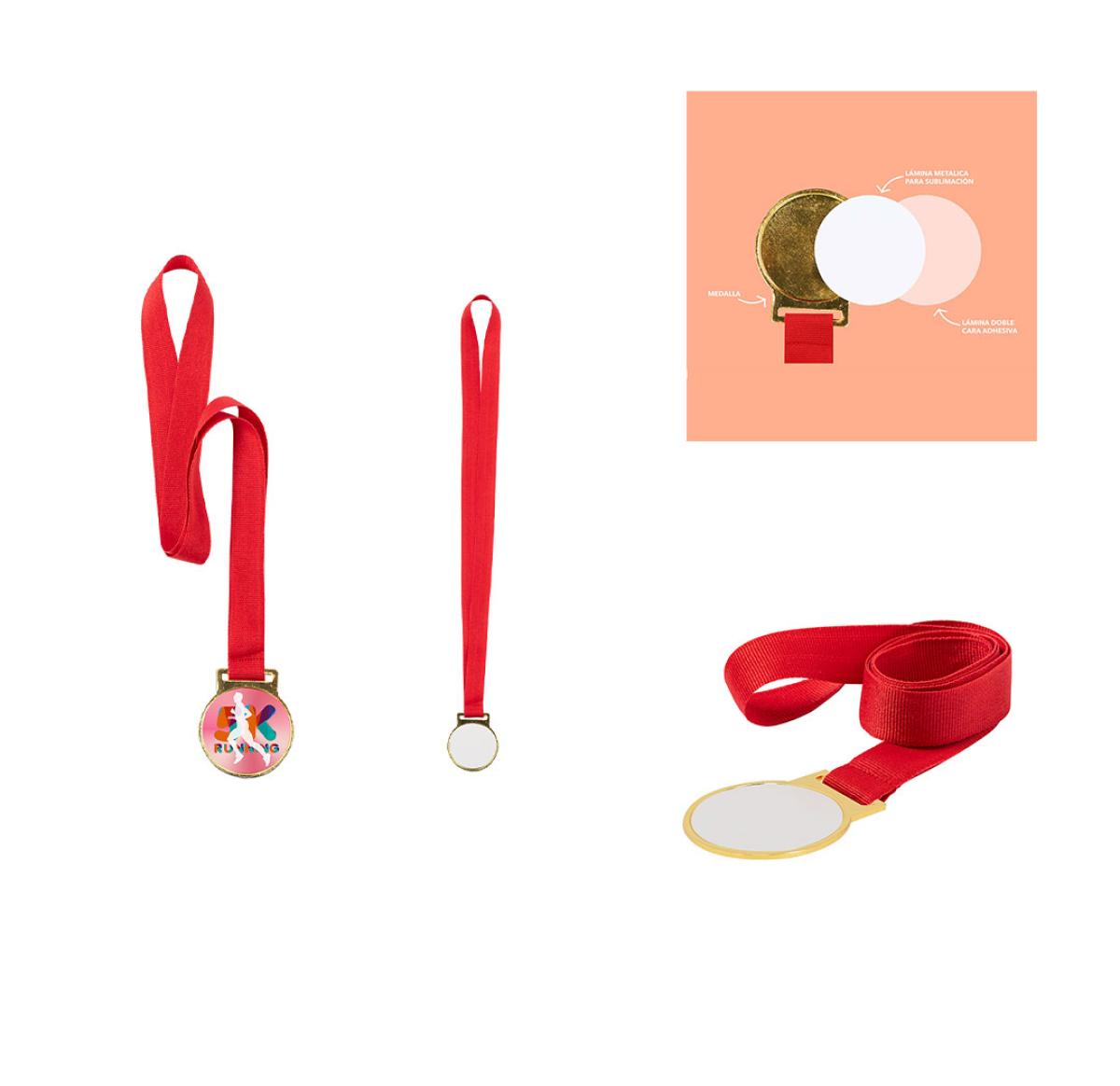 Metal medal with smooth gold finish, specially designed for sublimation marking (not integrated into the product, ideal for printing and applying later). Red polyester ribbon included.