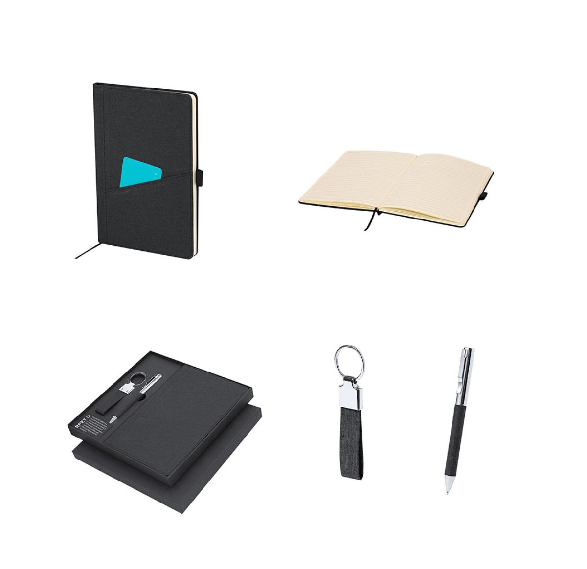 Elegant premium set that includes: Notepad in RPET in elegant black colour. Includes elastic closure, front pocket, and fabric bookmark. Interior with 80 lined cream-coloured sheets. Pen in RPET with matte black finish, rotating mechanism, and blue ink. With clip and polished metal tip. Elegant keychain with strap made from RPET 300D polyester and chrome accessories. Set presented in individual matte finish case, with die-cut interior for each element of the set and RPET card inside. RPET material is made from recycled plastic, promoting the reuse of plastic waste and helping to sustain the planet.