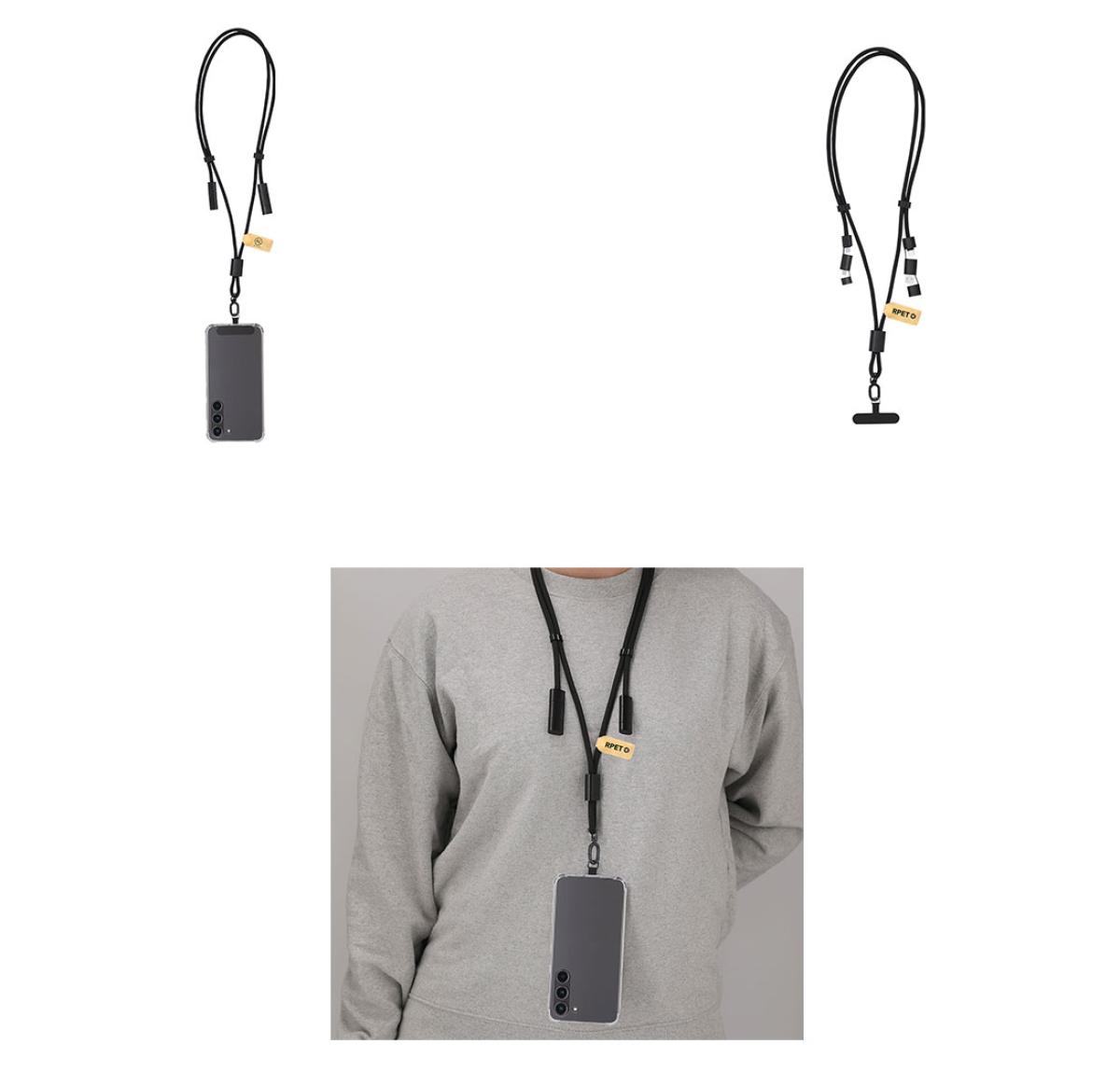 Innovative lanyard with support and charging cable function, made of a combination of RPET polyester and recycled aluminium. Designed to fit easily between the case and smartphone thanks to its transport accessory. Includes matching strap, rotating black metal carabiner, and neck safety accessory. Offers charging and data transfer functionality, with USB and Type C input, and Micro USB, Lightning, and Type C outputs. Displays an RPET emblem on a kraft tag, highlighting its sustainable commitment. RPET material is made from recycled plastic, promoting the reuse of plastic waste and helping to sustain the planet. Recycled Aluminium is a material with almost infinite recycling possibilities, without losing its original properties and consuming less energy in this process. GRS certification (Global Recycled Standard), which guarantees the recycled origin of the material used to manufacture the product.
