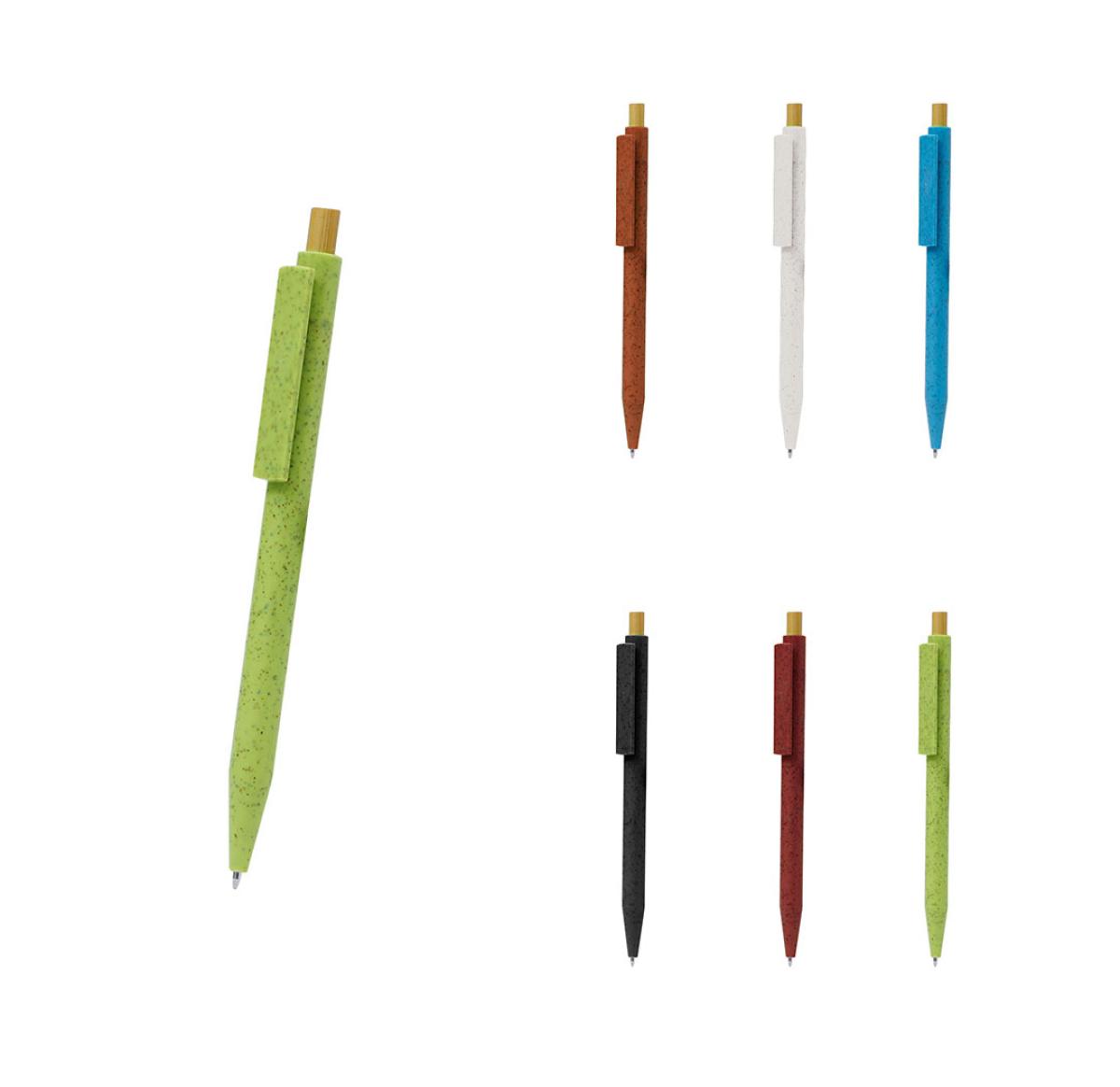 Pen made from wheat straw fibre. With matching body and clip, push mechanism made from bamboo and blue ink. With distinguished Wheat Straw logo embossed on the body. Wheat straw promotes the use of natural raw materials, thus reducing contaminating emissions.