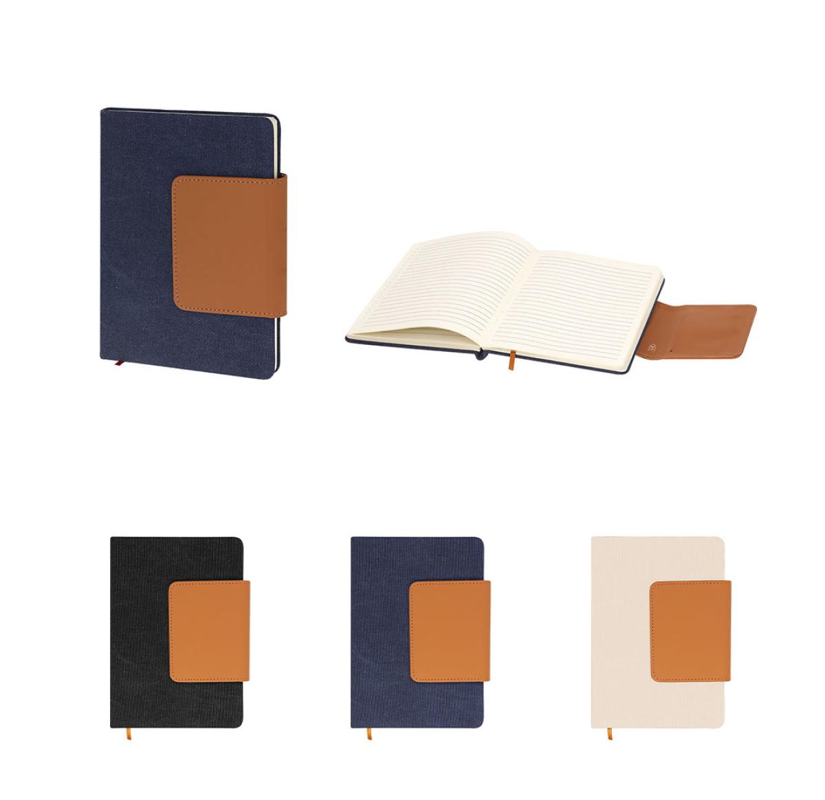 A5 notebook made of a combination of Recycled Canvas and Recycled PU. Elegant design with brown flap featuring a magnetic closure, with practical card holder inside. Interior with 80 cream-coloured lined sheets and matching fabric bookmark with the flap. Featuring a Recycled PU emblem. Recycled PU stands out for its resistance and elasticity. This recycled and recyclable material is a sustainable option that recovers discarded fibres during manufacturing processes, thus minimizing material waste and contributing to reduce environmental impact while maintaining its original properties.