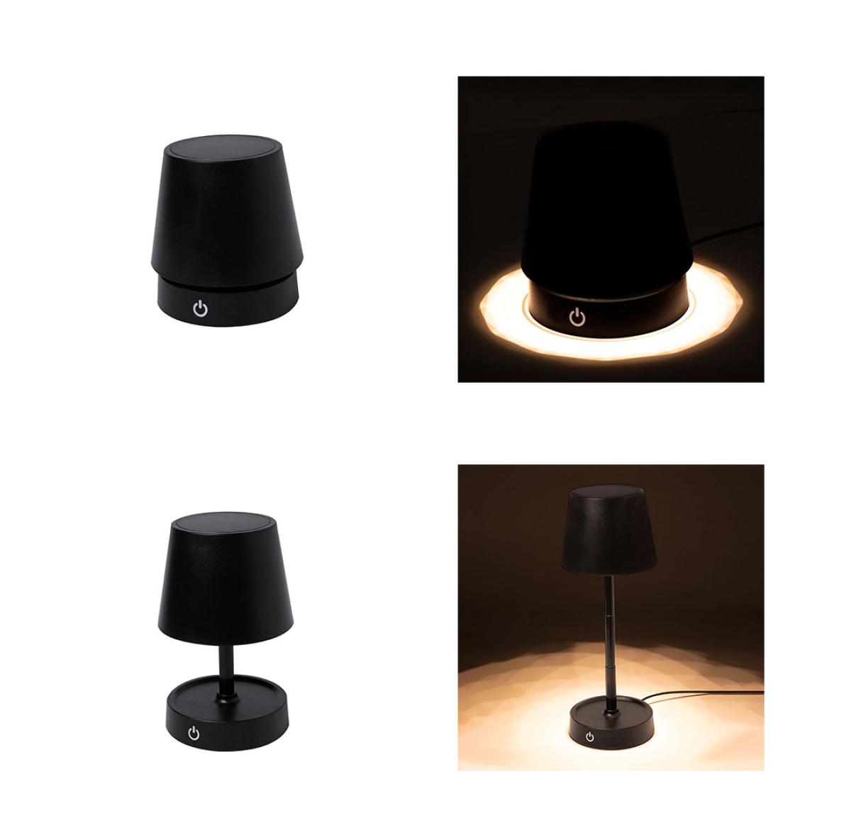 Lamp with a design in matte black finish. Includes a touch dimmer system and a foldable body to adjust height. Equipped with a rechargeable 800mAh battery via USB Type C -cable included- and 12 warm light LEDs. With an on/off button on the back.