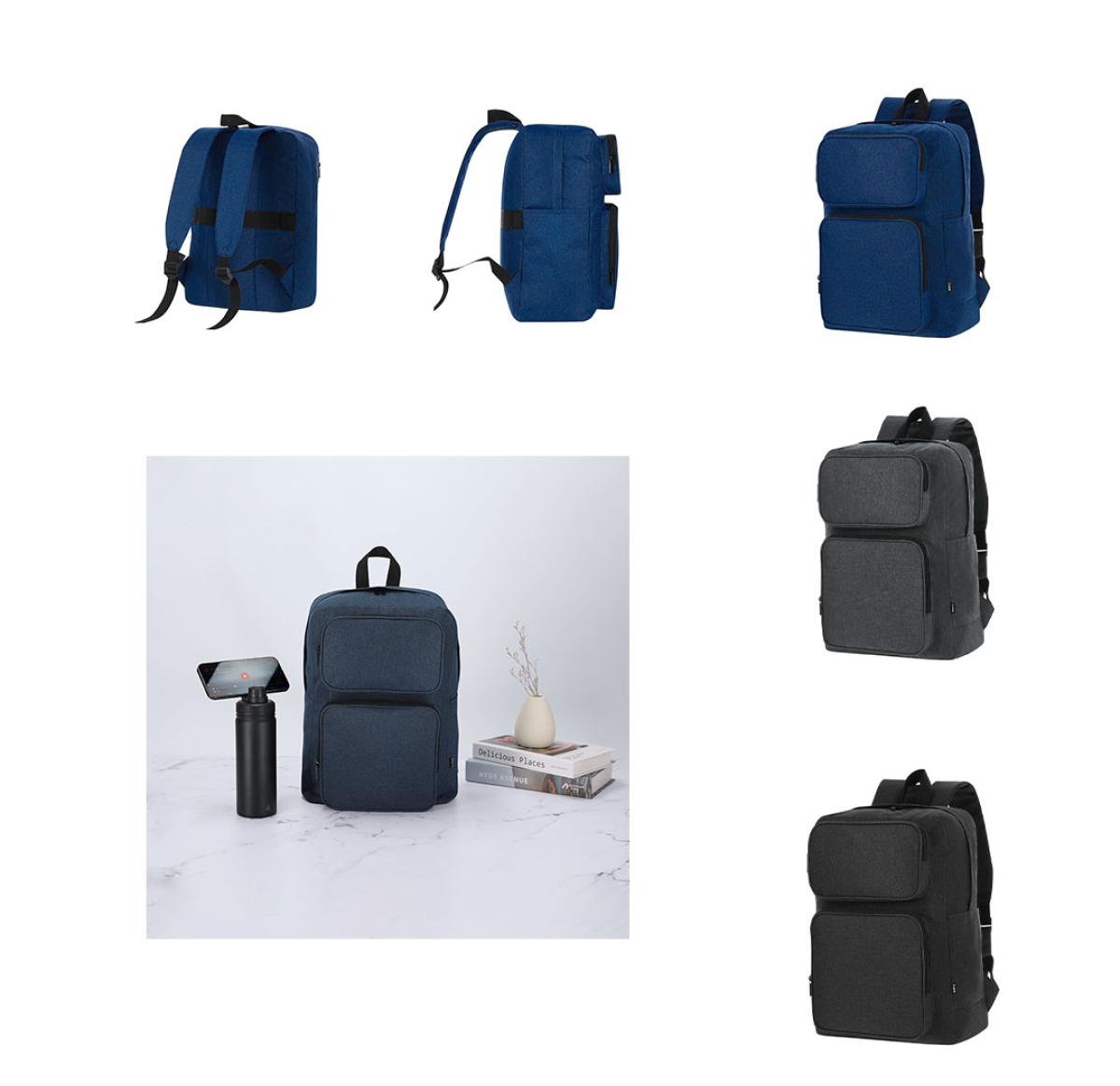 Backpack made from soft RPET 600D polyester. With main pocket with zipper closure and double pull. Interior pocket for a laptop of up to 15 inches and tablet of up to 10 inches. Includes two front pockets with zipper closure and a pocket on the side. Padded adjustable back and straps. Includes a transport strap for adjustment on a trolley or suitcase, ideal for travel. With RPET designation on the label. RPET material is made from recycled plastic, promoting the reuse of plastic waste and helping the sustainability of the planet.