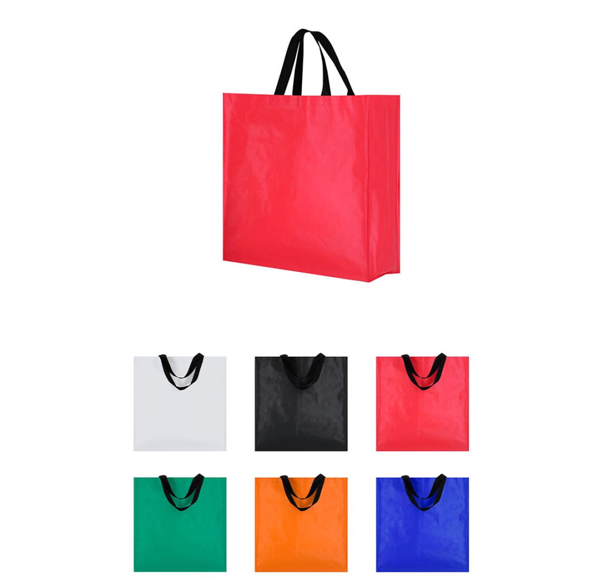 Bag made of laminated pp-woven. With long handles of 45x3 cm reinforced with X stitching and capable of holding up to 8 kg.