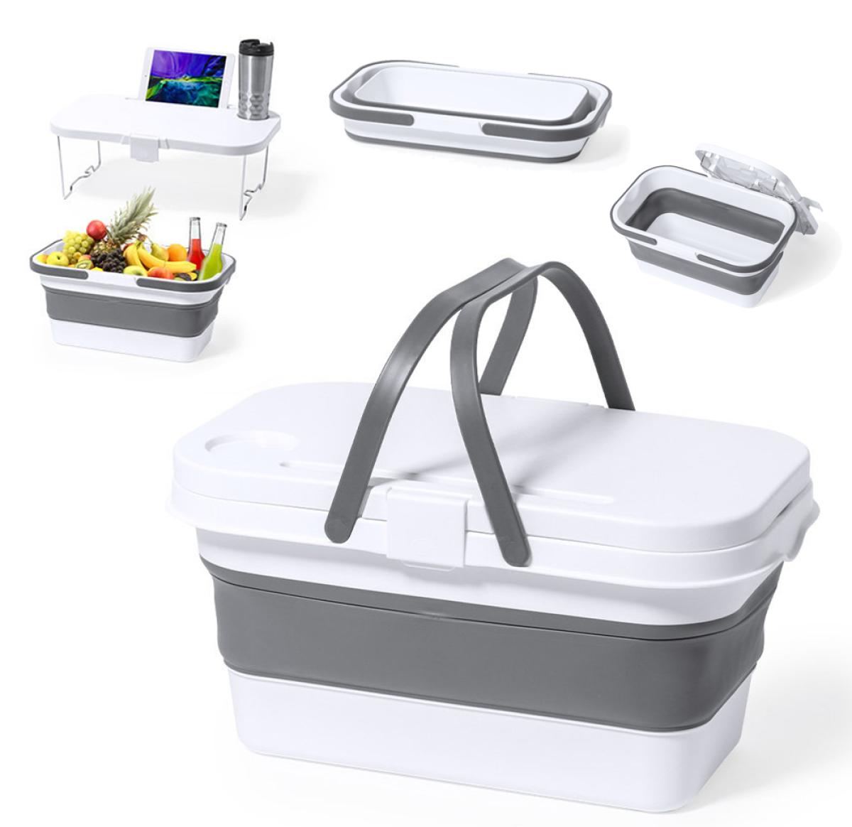 Foldable, multifunctional picnic cooler basket. Made of resistant PP material in white finish, with a capacity of 16 litres. Lid convertible into a table by means of 2 folding legs, with built-in holders for smartphone/tablet and bottle. Including 2 folding carry handles in grey. Small size when folded, ideal for an easy storage.