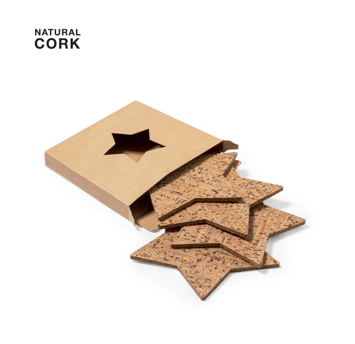 Set of 4 star shaped coasters made in natural cork. Set presented in a design cardboard kraft box with die-cut star design. Made with vegetable elements to promote the use of natural raw materials and reduce pollutant emissions.