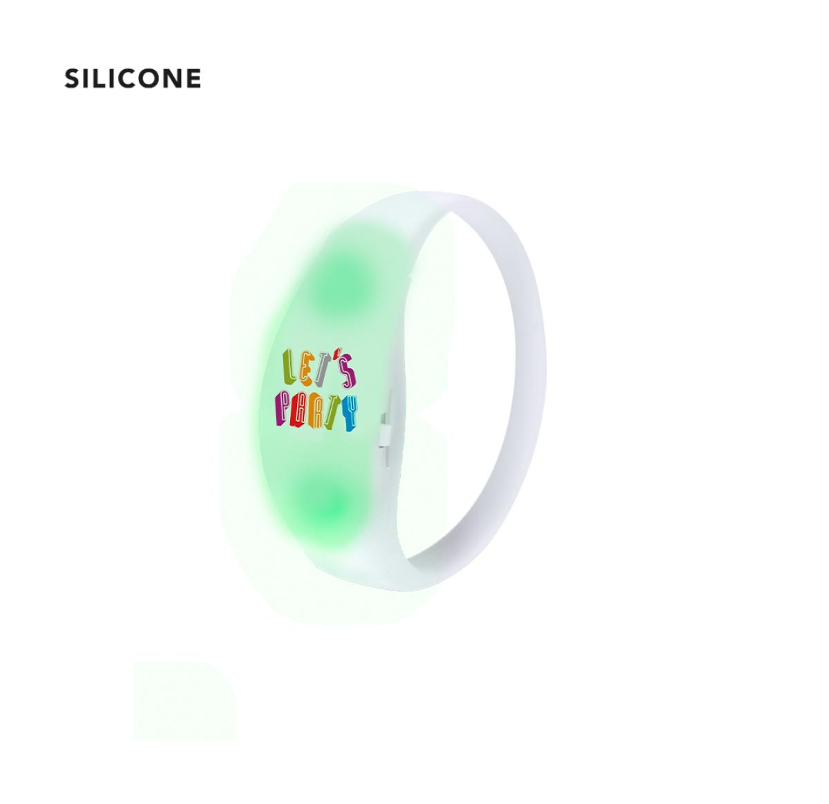 Cool bracelet with LED lights. In soft silicone and with 2 coloured LED lights inside, powered by a button cell battery (included). With a hidden sound-sensitive switch that automatically changes the colour of the lights to the rhythm of the music. Individually packaged in a Recycled paper bag.