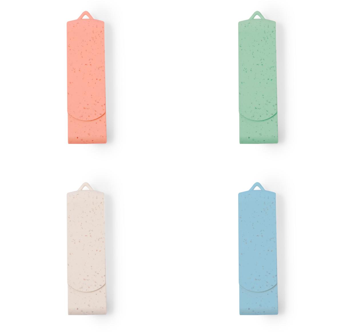 USB flash drive with 16GB capacity. Made of wheat straw, with matching swivel clip and available in a wide range of colours. Presented in an individual eco-designed case, made of wheat straw with a natural finish and die-cut inside. Wheat straw promotes the use of natural raw materials, thus reducing pollutant emissions.