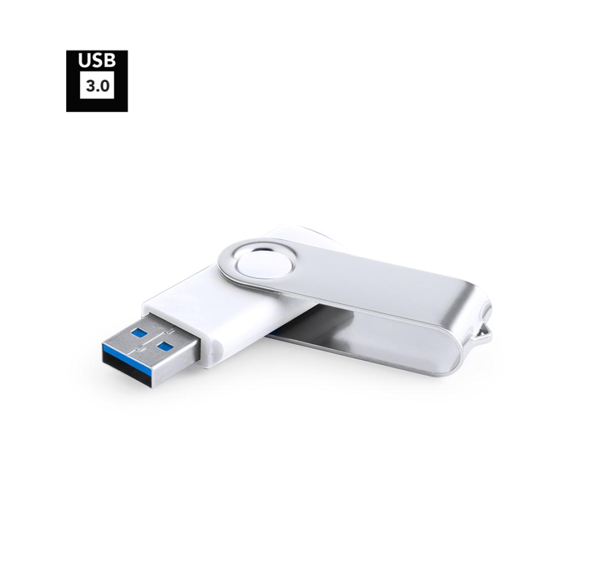 USB flash drive 3.0 with 16GB capacity. Metal clip and smooth white finish body. Presented in an individual case.