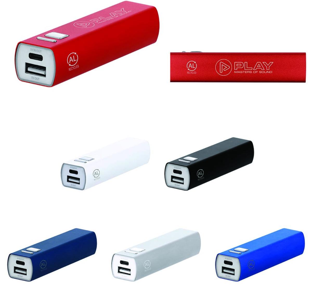 External auxiliary battery made of recycled aluminium, with a charging capacity of 2600 mAh. Easy to carry thanks to its small size, with ON/OFF button for charging control and Type C input/output connectors + USB output. Including LED charging light and Type-C cable. Available in a wide range of colours. The capacities shown in all our external auxiliary batteries are real, all of them incorporating non-recycled, grade A batteries, with a service life of at least 500 charging cycles, and complying with CE regulations. They are manufactured according RoHS standards, and in compliance with the following safety requirements: Power bank overcharge protection system. Complete discharge protection system, which increases the durability of the power bank. Blocking system to prevent short circuits. Constant charging transfer system, in accordance with the capacity of the target device.