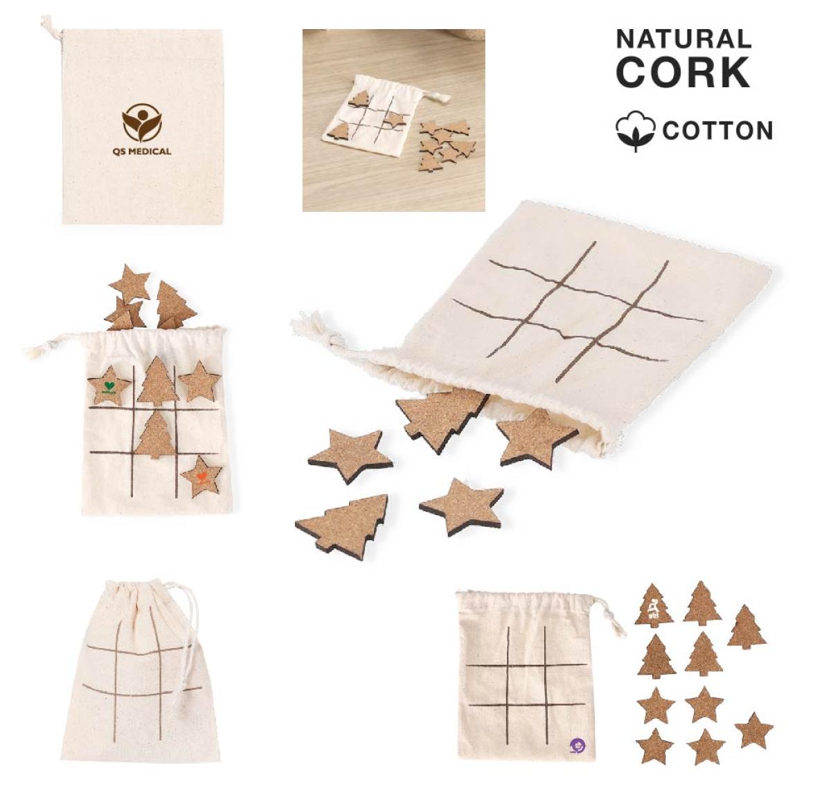 Tic-tac-toe game made of natural cork. Including 5 tree-shaped tokens and 5 star-shaped tokens. Presented in a cotton bag with drawstring closure to be used as game board. Made with plant-based elements to promote the use of natural raw materials and reduce polluting emissions.
