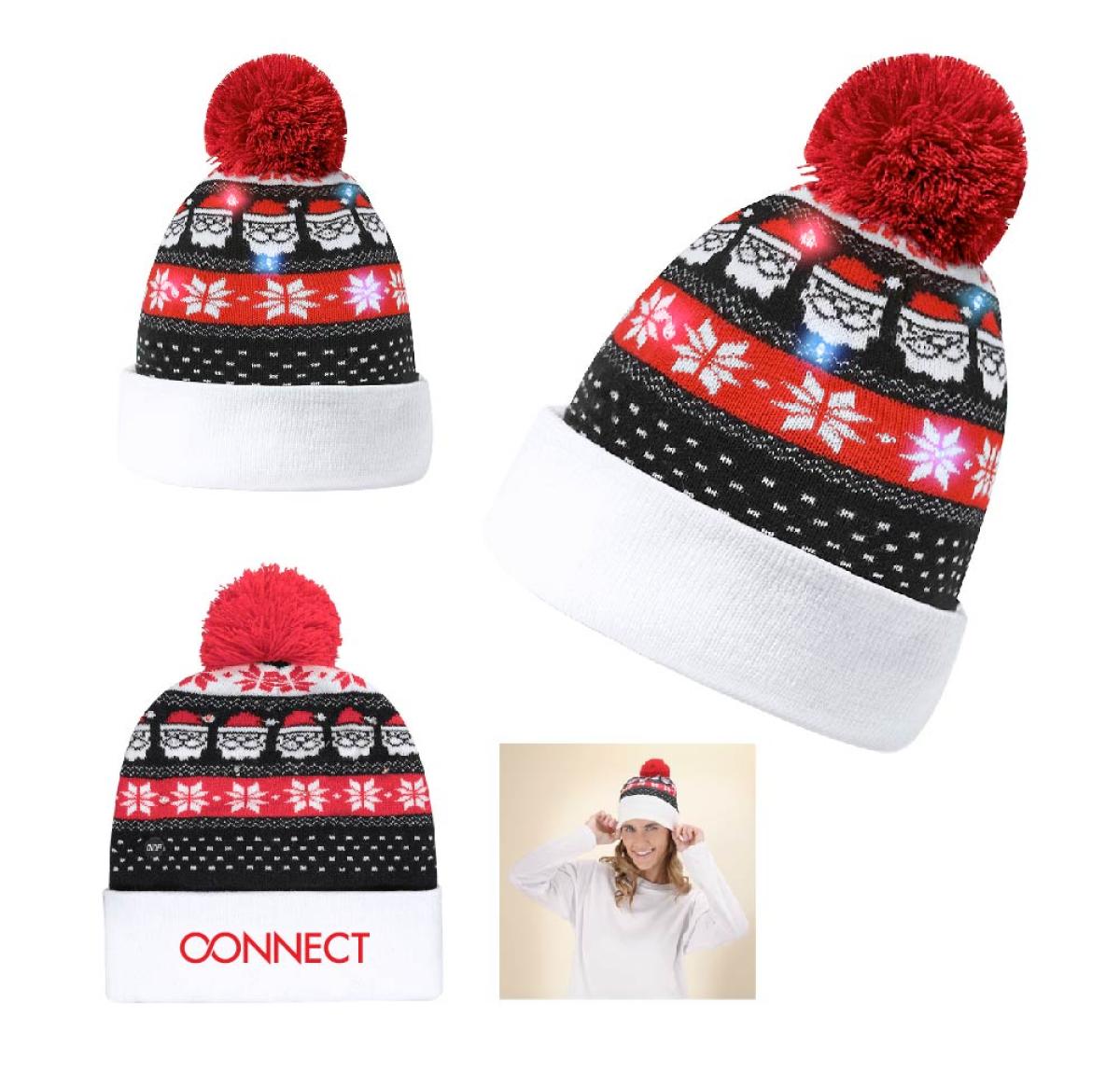 Christmas Hat with LED Light and Pom Pom Design. Features 6 multicoloured LEDs with both steady and flashing light options (button cell battery included, NULL). Made from soft acrylic. An ideal gift to fight the cold and add a touch of warmth and fun.