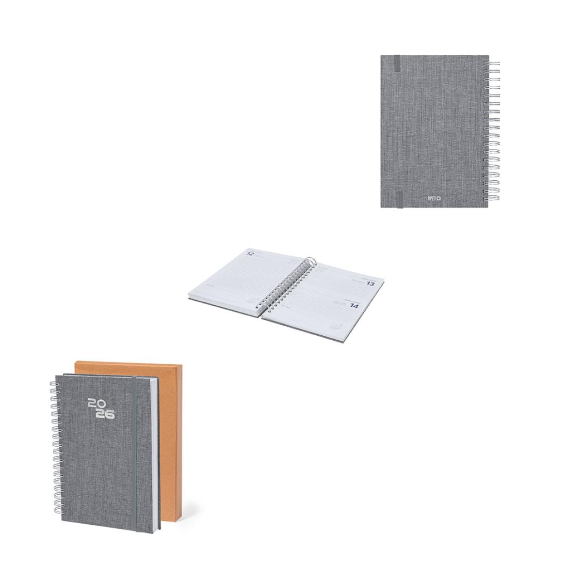 B5 size ring diary in soft and resistant RPET, with hard covers and elastic band closure. It includes a kraft presentation box and an RPET logo. Weekly view, with an area for notes and fabric bookmark. In 2 languages: English and Spanish. PET material is made from recycled plastic, thus promoting the reuse of plastic waste and helping the sustainability of the planet.