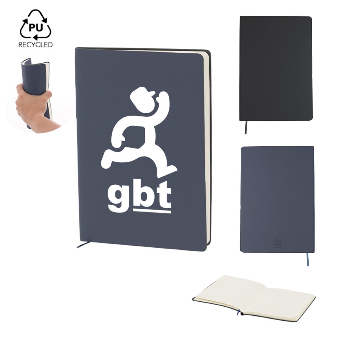 Notepad with soft cover made of recycled PU leather. Inside with 80 cream-coloured sheets of single-stripe layout. With matching bookmark and Recycled PU leather logo. The recycled PU leather stands out for its resistance and elasticity. This recycled and recyclable material is a sustainable option that rescues the fibres discarded in the manufacturing processes, thus minimising the waste of material and contributing to reduce the environmental impact, while keeping its original properties.