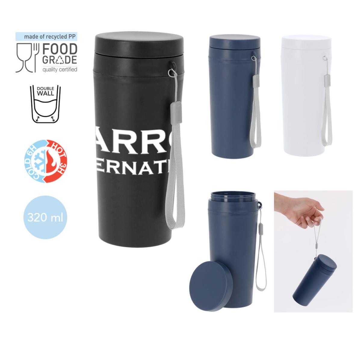 Insulated bottle made of resistant Recycled PP with 320ml capacity. With screw top lid and including a carrying strap. Recycled PP is a recycled and highly recyclable plastic, highly resistant and suitable for a multitude of applications.