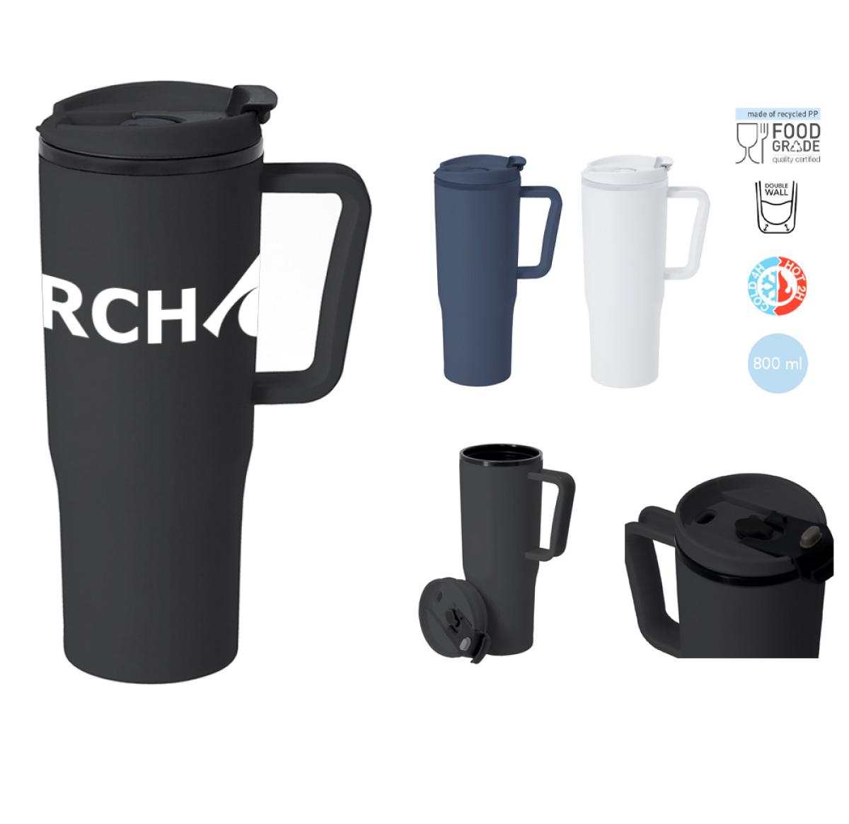 Insulated Mug made of durable double-walled Recycled PP. Has an 800ml capacity. Lid with easy-open dispenser, including a straw hole. BPA-free. It includes an ergonomic handle . With recycled PP logo. Recycled PP is a recycled and highly recyclable plastic, highly resistant and suitable for a multitude of applications. Food Grade certified, guaranteeing safety when food comes into contact with the material used to manufacture the product.