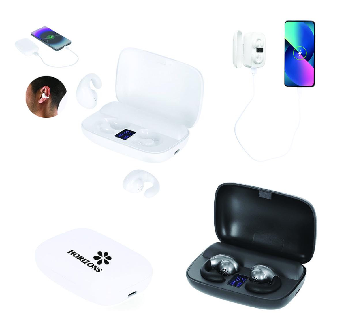 Open Ear Earphones with Power Bank are designed for a perfect and comfortable fit, thanks to the practical soft silicone clip. They provide a hassle-free listening experience, allowing you to enjoy music or calls with total comfort. Bluetooth? 5.4 connection and hands-free function. Touch control button integrated in the earpiece. Includes matching charging base with power bank function and a 1200mAh battery, Type-C USB input and output. With internal battery status display and charging cable included (Type-C,NULL).In addition, they are manufactured according RoHS standards, and in compliance with the following safety requirements: Power bank overcharge protection system. Complete discharge protection system, which increases the durability of the power bank. Blocking system to prevent short circuits. Constant charging transfer system, in accordance with the capacity of the target device.