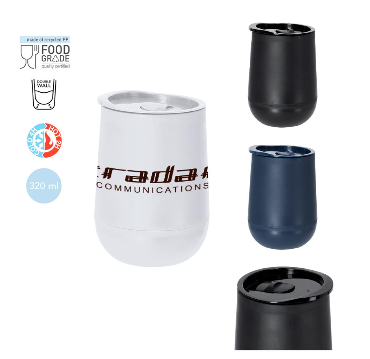 Thermal cup made of durable double-walled recycled PP with a capacity of 320 ml. It is ideal for your desk, table, or any surface where you can enjoy your favourite drink. Lid with easy-open dispenser, BPA free. Recycled PP is a recycled and highly recyclable plastic, highly resistant and suitable for a multitude of applications. Food Grade certified, guaranteeing safety when food comes into contact with the material used to manufacture the product.