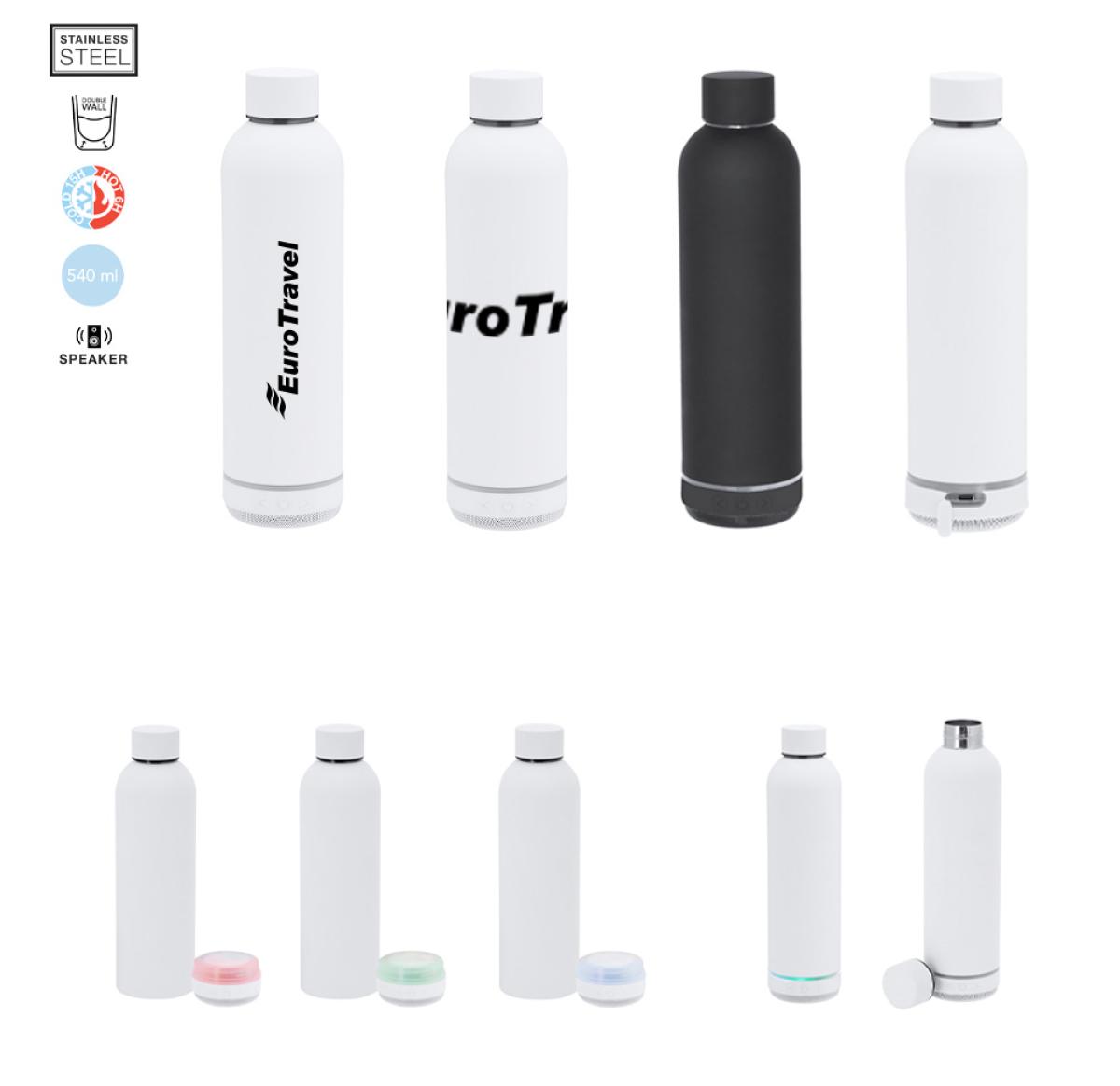 Thermal bottle with integrated Bluetooth? 5.3 speaker of 3W. With a capacity of 540 ml and made of double-walled stainless steel, ensuring maximum durability and excellent temperature maintenance for both cold and hot beverages. With a screw-on lid and BPA-free. It is ideal to have on your desk, table, or any surface where you can comfortably enjoy your favourite drink. It features a matching non-slip base for greater stability. The Bluetooth speaker integrated into the base of the bottle is easily removable thanks to its screw system and includes intelligent RGB LED lighting that syncs to the rhythm of the music, creating a unique visual and auditory experience. Additionally, the hands-free function allows you to take calls without having to stop what you're doing.