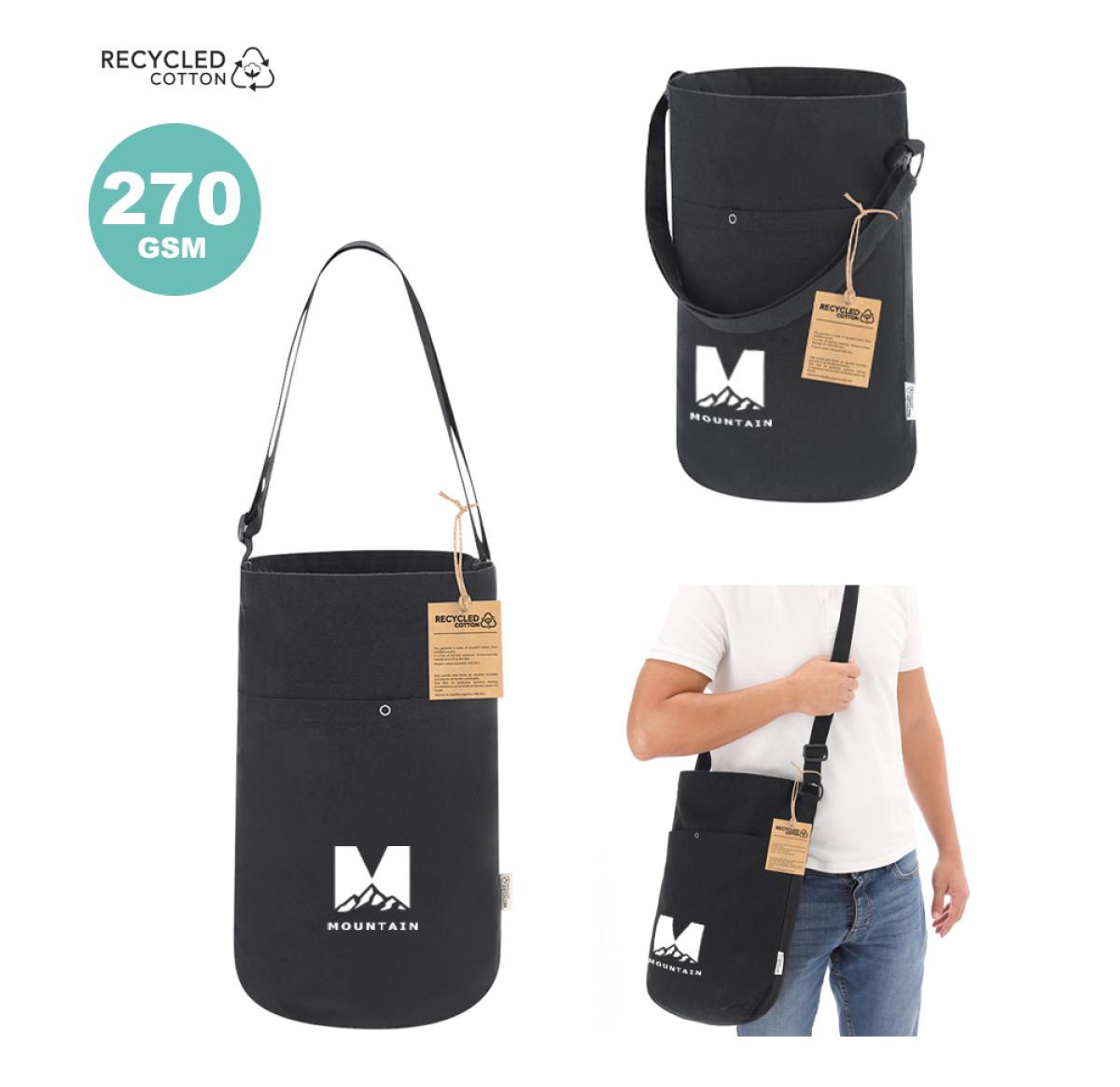 Bag made of recycled cotton with 270g/m2. Original cylindrical shape with large capacity, with main compartment, auxiliary inner pocket and practical outer pocket with metal clasp closure. Elegant black colour, stitched finish, and an adjustable reinforced long handle. Recycled Cotton logo on outside label.